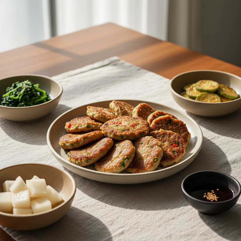 든든한 단백질 반찬이에요. 다진 소고기나 돼지고기에 두부를 으깨어 넣으면 부드러워져요. 여기에 다진 양파, 당근, 계란, 소금, 후추를 넣고 치대듯이 섞어주세요. 동그랗게 빚어서 밀가루와 계란물을 입혀요. 팬에 식용유를 넉넉히 두르고 앞뒤로 노릇하게 지져내면 완성이에요.