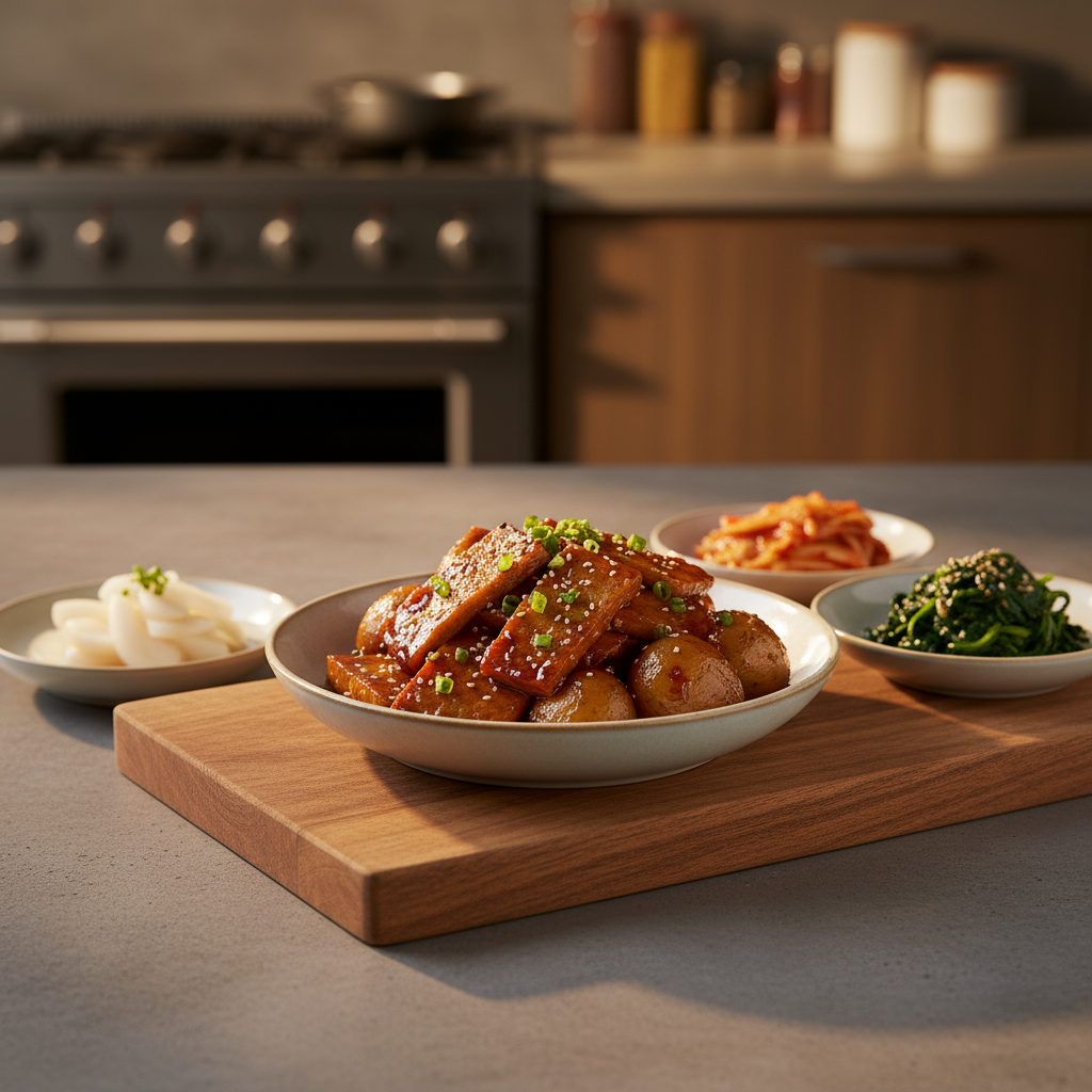 짭조름한 맛이 밥도둑인 메뉴예요. 어묵은 끓는 물에 한번 데쳐 기름기를 제거하고, 감자는 한입 크기로 썰어주세요. 냄비에 물 반 컵, 간장 3스푼, 물엿 2스푼을 넣고 끓이다가 감자와 어묵을 넣어요. 중불에서 국물이 자작해질 때까지 조리면 완성이에요. 파와 통깨를 뿌려주면 더 맛있어요.