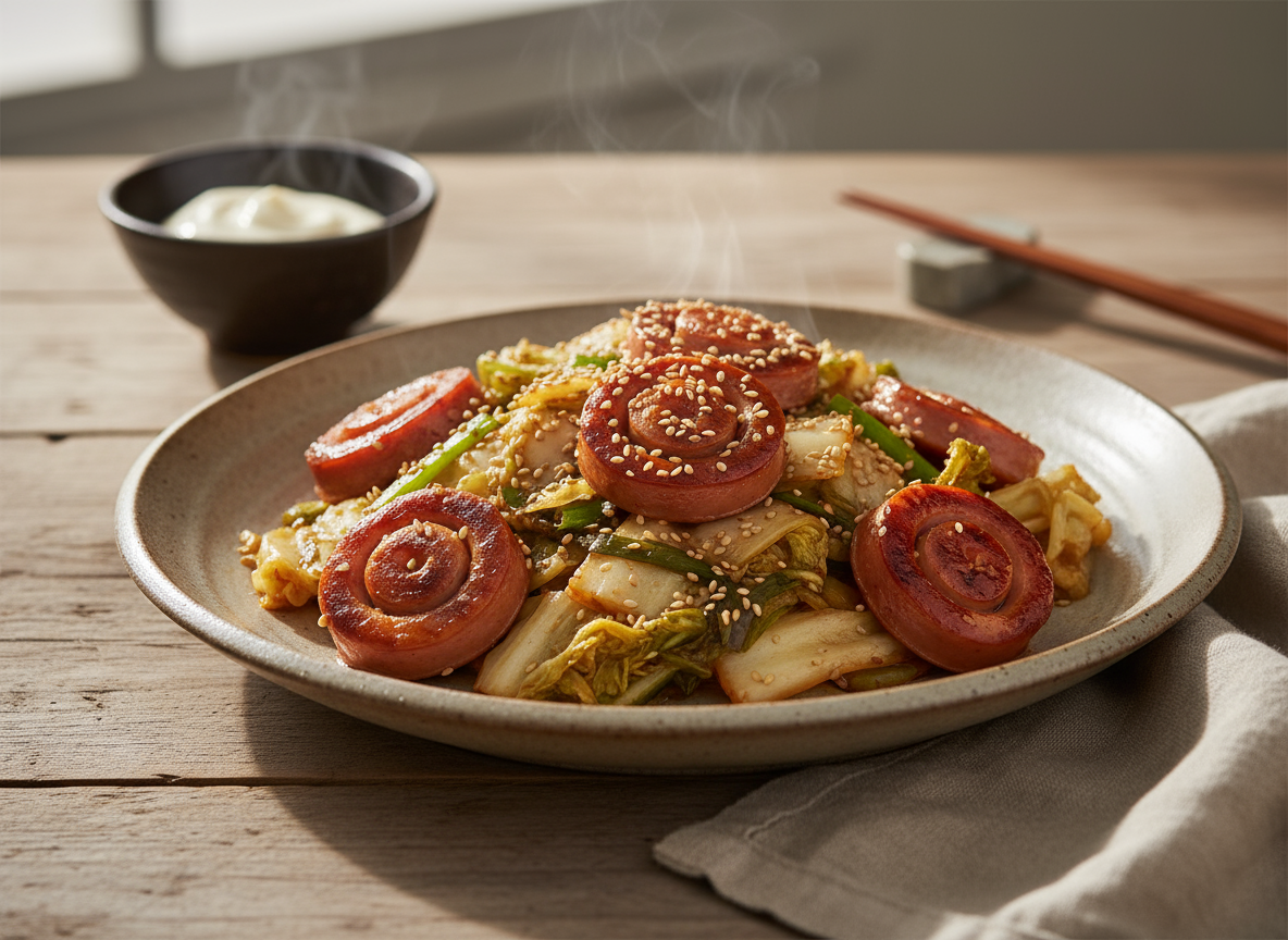 비엔나 소세지와 배추를 활용한 초간단 반찬이에요. 배추는 먹기 좋게 썰고, 소세지는 어슷 썰어주세요. 팬에 식용유를 두르고 소세지를 먼저 볶다가 배추를 넣어요. 들깨가루 한 스푼을 넣으면 고소함이 배가되고, 간장과 올리고당으로 간을 맞추면 아이들도 좋아하는 맛이 완성돼요.