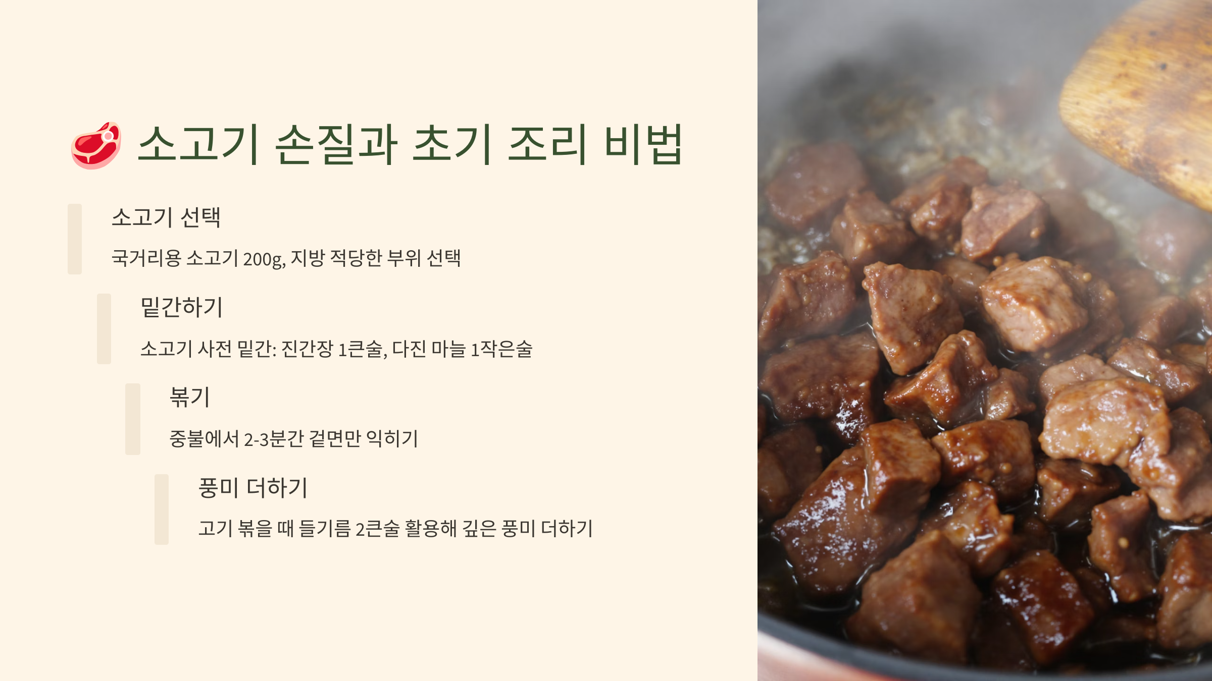 | 국물 베이스 | 소고기 (양지/사태) | 깊은 감칠맛. 핏물 제거 필수. 참기름에 볶기 |