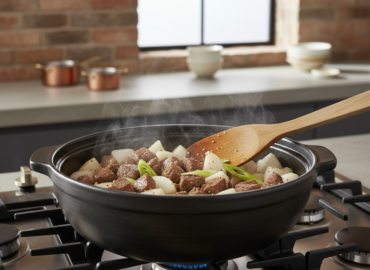 2. 무 넣고 함께 볶기: 소고기 겉면이 익으면 썰어둔 무를 넣고 함께 볶습니다. 이때 무가 소고기 기름과 참기름을 흡수하며 투명해지기 시작합니다. 이 과정에서 무의 시원한 맛이 기름과 어우러져 국물 맛의 바탕을 만듭니다. (이 소고기무국 끓이는법이 정말 중요해요!)