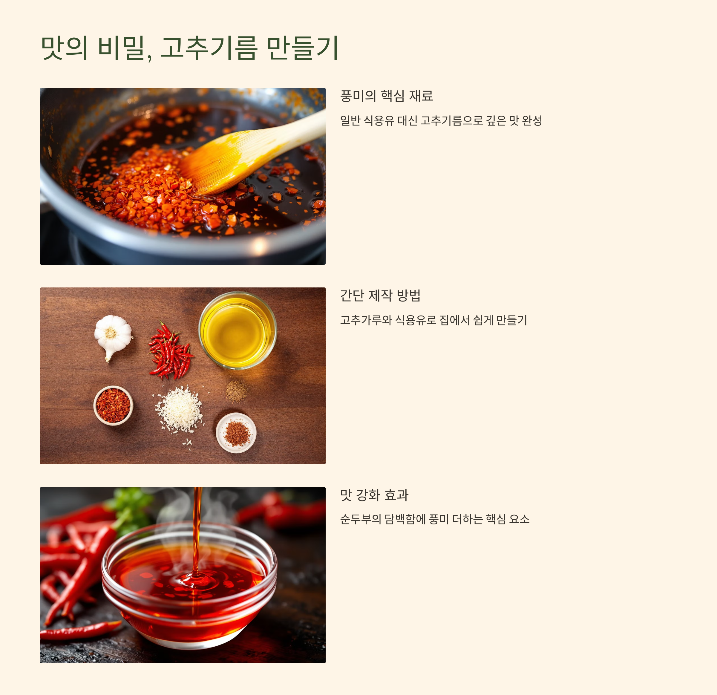 - 고추기름의 농도: 고춧가루를 볶을 때 타지 않도록 불 조절에 신경 써주세요. 고추기름이 잘 나야 찌개의 색감과 풍미가 좋아집니다. 이것이 바로 순두부찌개 황금레시피의 중요한 부분이죠.