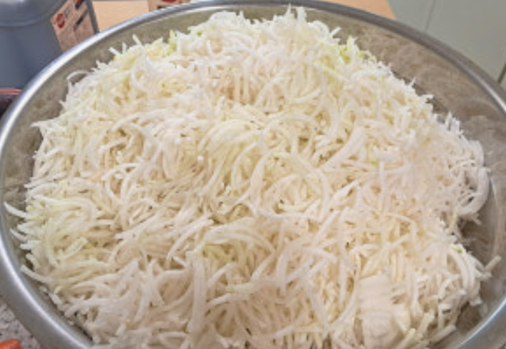 큰 볼에 채 썬 무를 담고 고춧가루를 넣어 먼저 버무려 색을 입혀줍니다. 여기에 식혀둔 찹쌀풀, 다진 마늘, 다진 생강, 액젓, 새우젓, 매실청을 모두 넣고 골고루 섞어주세요.