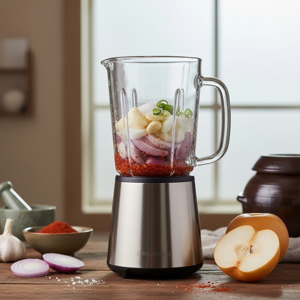 믹서기에는 양파, 배, 다진 마늘, 다진 생강, 새우젓을 함께 넣고 곱게 갈아줍니다. 젓갈 냄새에 예민하다면 새우젓을 갈아 넣는 것이 훨씬 깔끔한 맛을 냅니다.