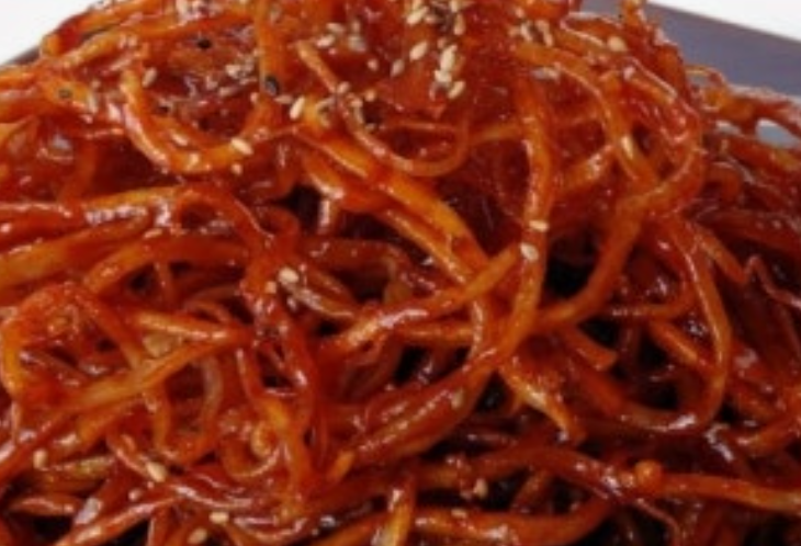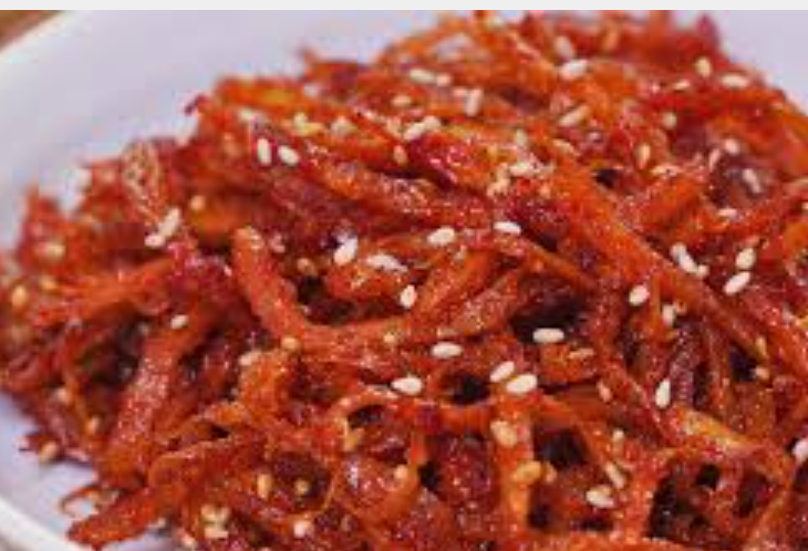 많은 분들이 진미채를 팬에 넣고 오래도록 볶기 때문에 딱딱하게 만듭니다. 진미채는 열을 가할수록 수분이 빠져나가 질겨져요.