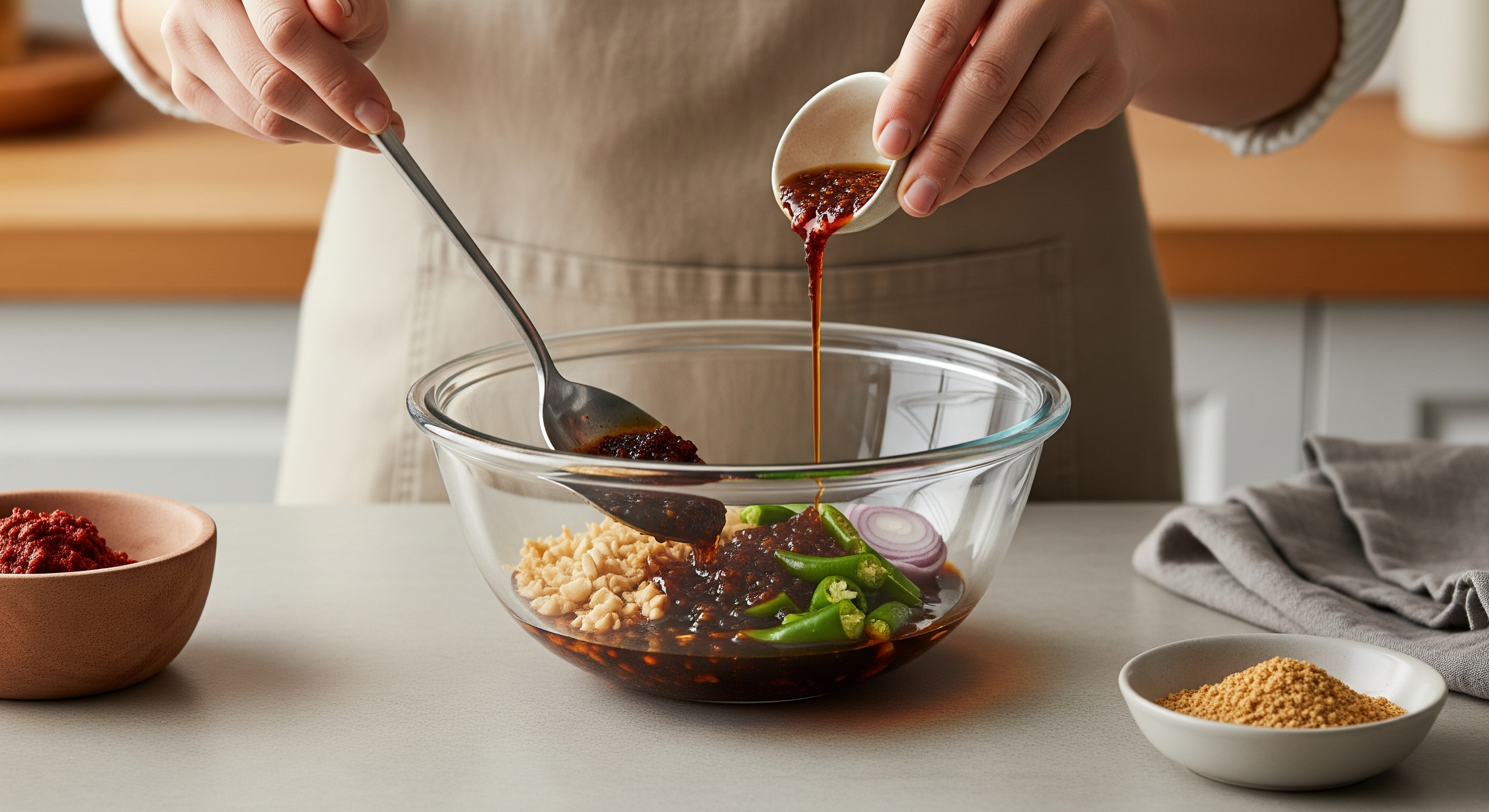잡채의 맛은 결국 양념장이 좌우합니다. 너무 달지도, 짜지도 않게 입에 착 감기는 맛을 내는 것이 중요한데요. 제가 정착한 잡채 황금레시피 양념 비율을 소개합니다. 이 양념장은 고기/버섯 밑간과 당면 조림, 그리고 마지막 무침까지 모두 활용할 거예요.