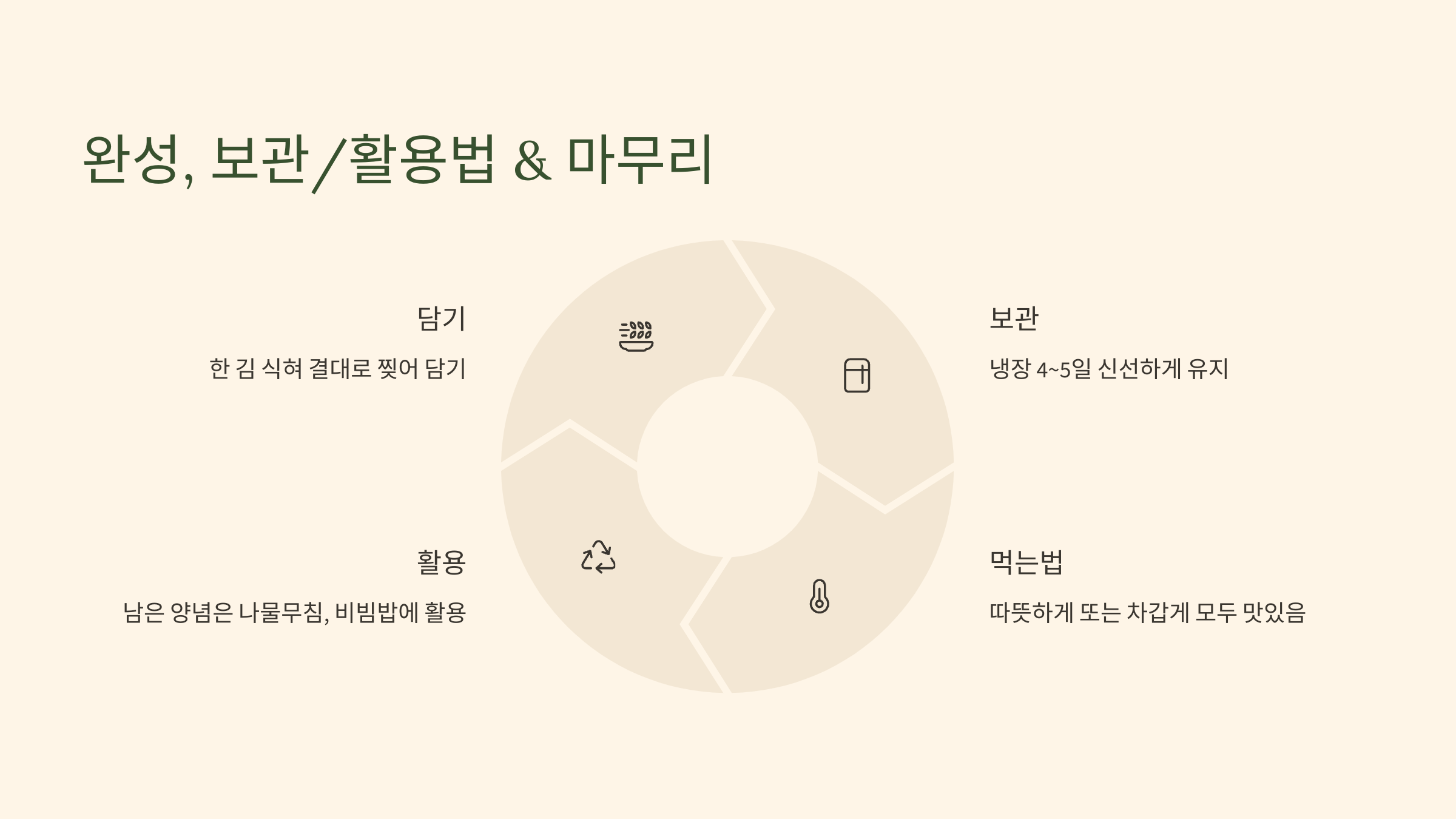 보관 중 기름이 하얗게 굳을 수 있는데, 이는 자연스러운 현상이니 안심하고 드셔도 됩니다. 드실 때 살짝 데우거나 차갑게 그대로 즐겨도 좋습니다.