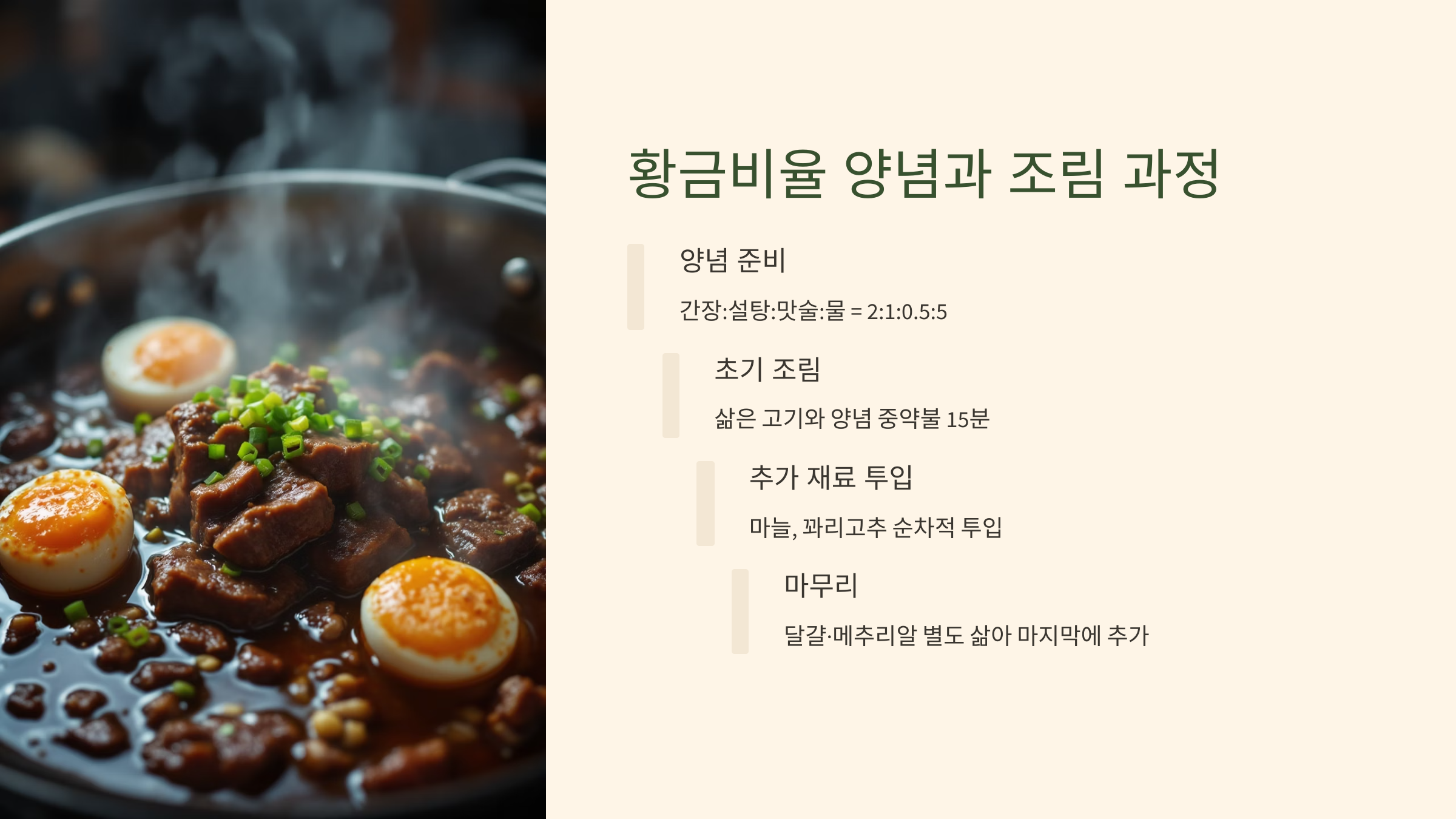 - 간 조절: 처음부터 간장을 너무 많이 넣기보다, 중간에 맛을 보고 추가하는 것이 좋습니다. 설탕 대신 매실액이나 배즙을 넣으면 자연스러운 단맛과 연육 작용을 도와줍니다.
