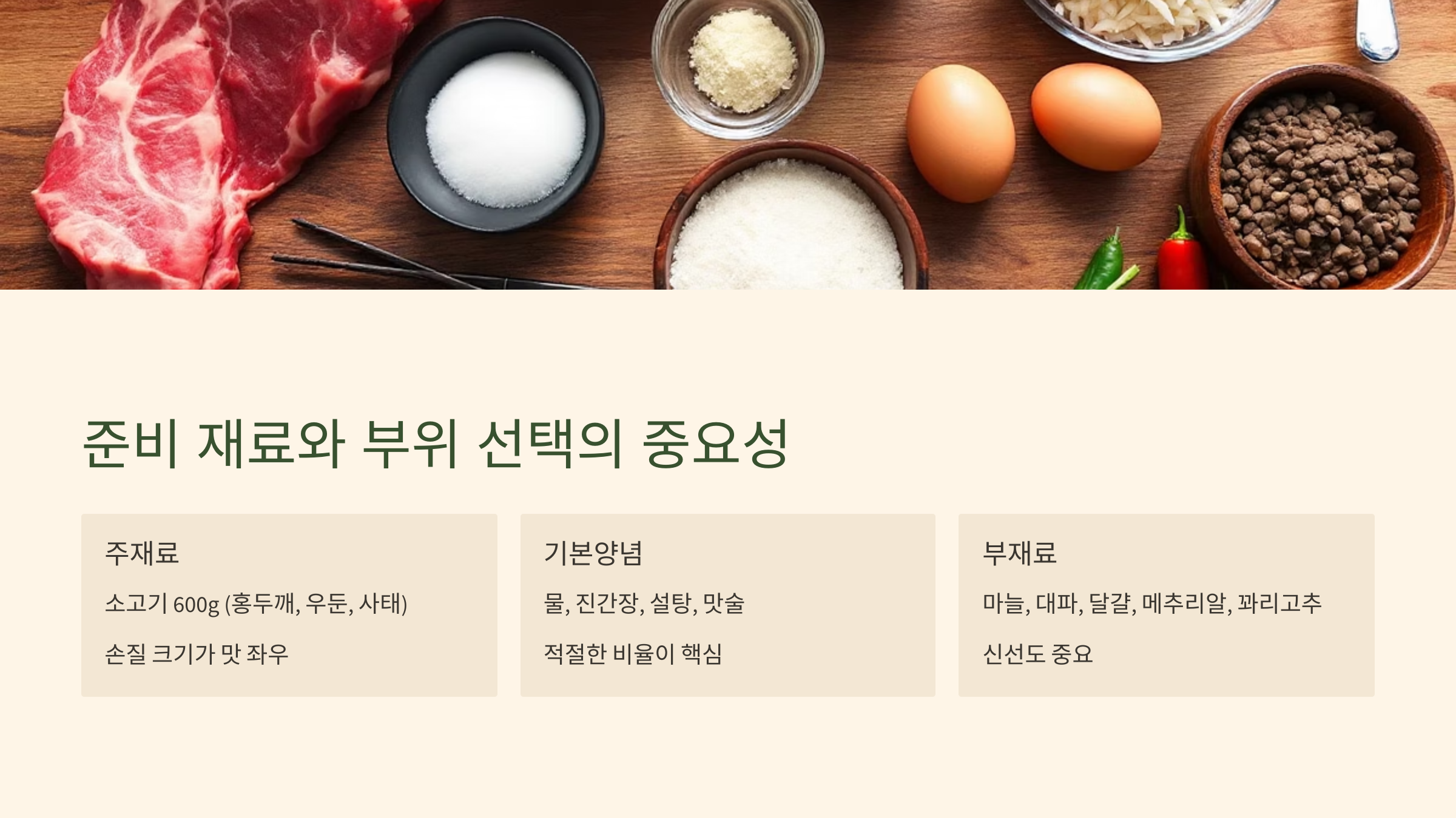 최고의 맛을 내기 위한 첫걸음은 신선한 재료 준비입니다. 아래 표를 참고하여 꼼꼼하게 준비해주세요. 특히 소고기 부위 선택이 맛을 크게 좌우하니, 추천 부위를 사용하시는 것이 좋습니다.