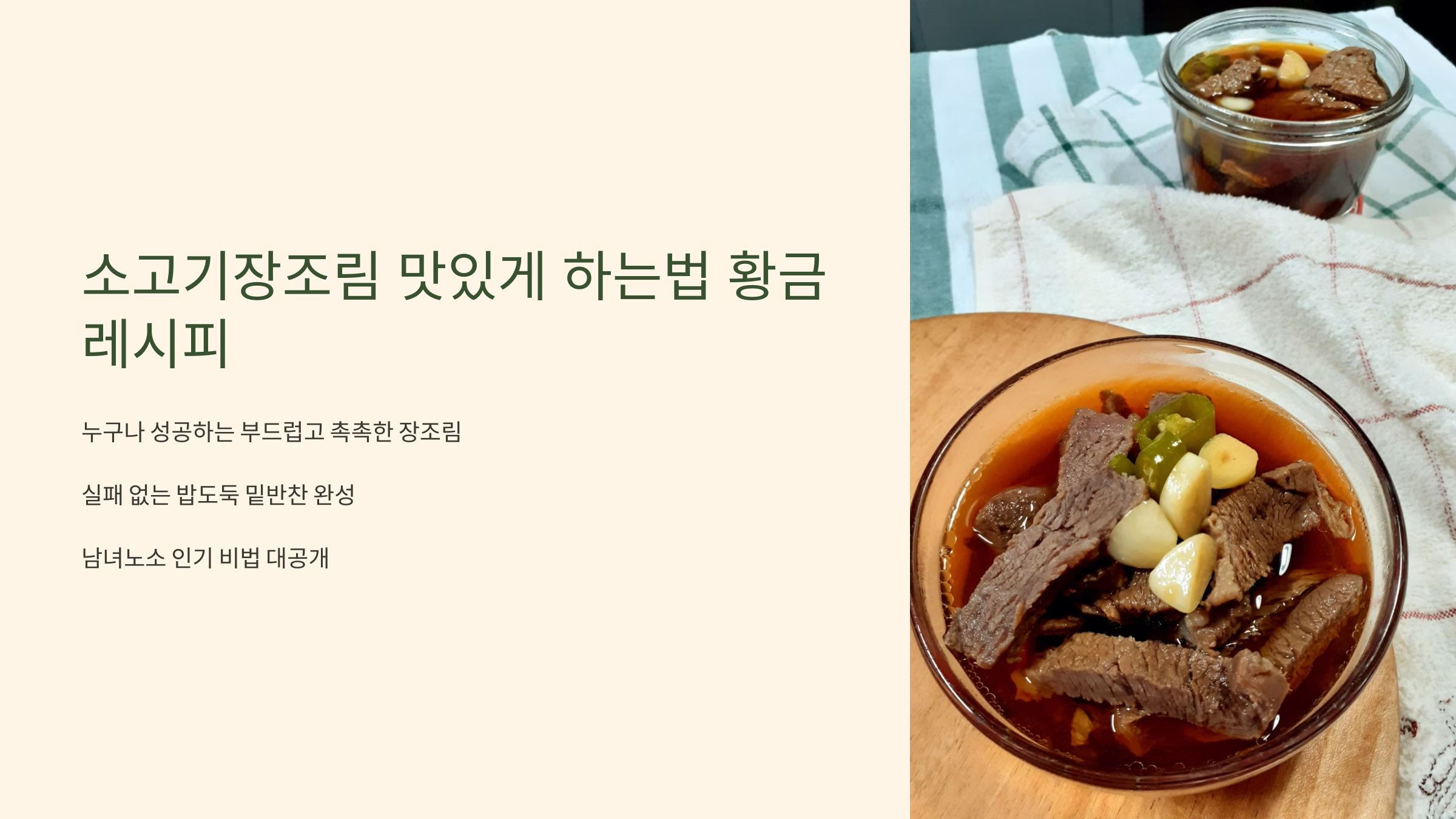오늘 제가 알려드리는 소고기장조림 황금레시피만 있다면 걱정 끝! 부드러운 소고기와 단짠단짠 양념의 완벽한 조화, 지금부터 그 비법을 자세히 알려드릴게요. 이 글을 통해 여러분도 맛있는 소고기장조림을 집에서 쉽게 만드실 수 있을 거예요!