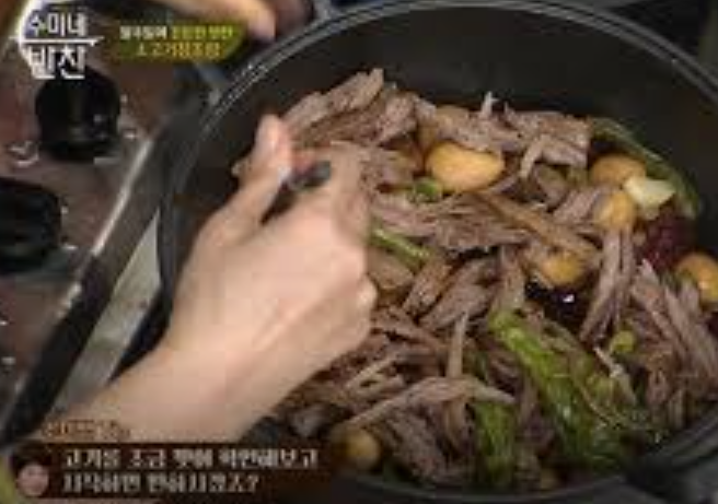 고기는 반드시 먼저 충분히 삶아서 부드럽게 만든 후 양념에 조려야 합니다. 날고기를 양념에 바로 넣고 끓이면 절대 부드러워지지 않습니다.