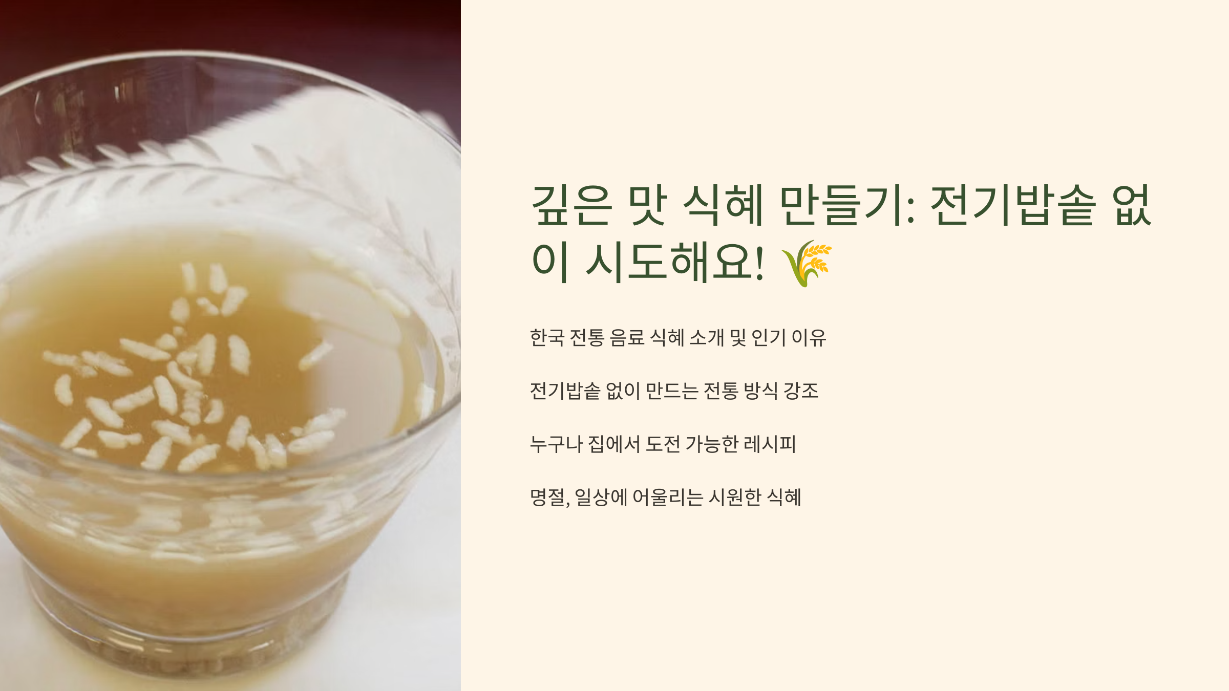 안녕하세요! 😊 오늘은 한국 전통 음료의 대표 주자, 바로 그 달콤하고 시원한 식혜를 집에서 직접 만들어보는 시간을 갖겠습니다.