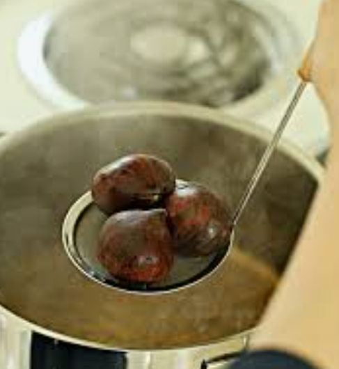 찬물에 식힌 밤은 윗부분(뾰족한 부분)을 칼로 살짝 자르거나 십(+)자 모양으로 칼집을 낸 뒤, 양옆을 꾸욱 누르면 속살이 쏙 하고 빠져나오기도 합니다.