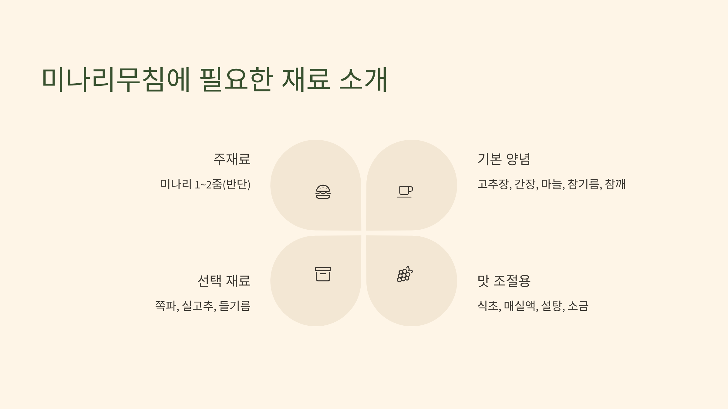 성공적인 미나리무침을 위한 첫걸음은 신선한 재료 준비입니다. 아래 목록을 참고해 주세요.