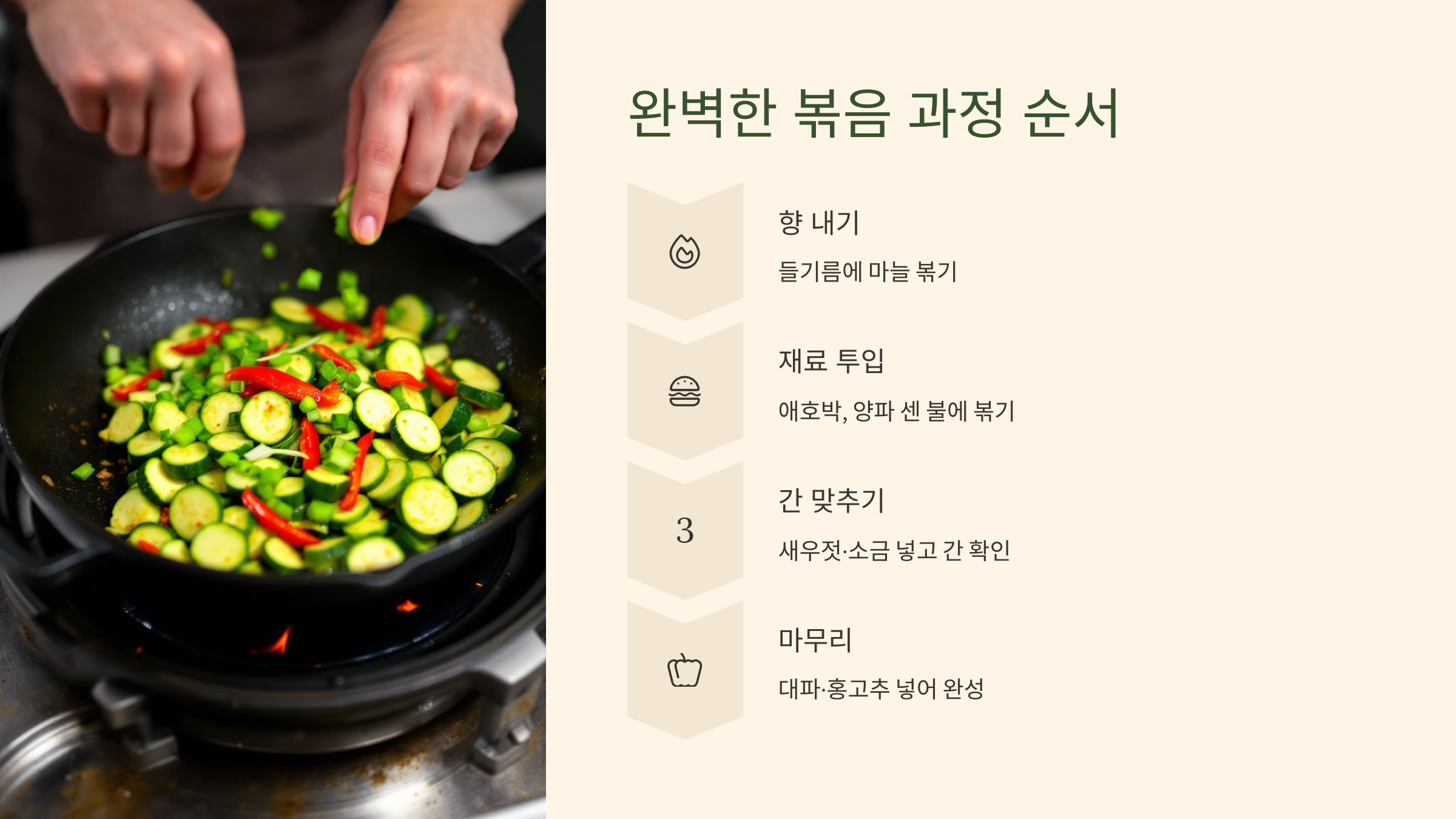 시중에 많은 애호박 볶음 레시피가 있지만, 오늘 소개할 방법은 몇 가지 작은 차이로 큰 맛의 변화를 가져옵니다. 핵심은 애호박의 수분을 적절히 조절하여 아삭한 식감을 살리고, 양념이 겉돌지 않고 착 달라붙게 하는 것입니다.