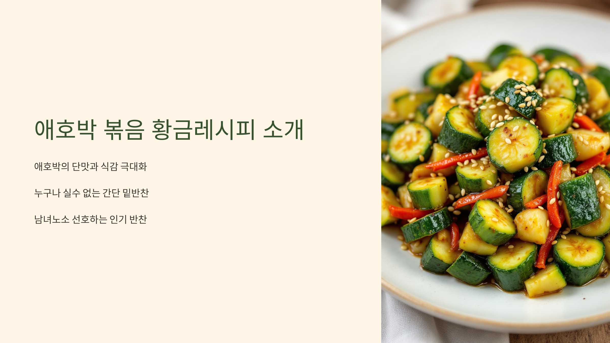 안녕하세요! 😊 오늘은 한국인 밥상에 빠지지 않는 친근한 채소, 애호박을 활용한 맛있는 밑반찬, 바로 '애호박 볶음' 황금레시피를 소개해 드리려고 합니다. 애호박 자체의 달큰한 맛과 부드러운 식감 덕분에 남녀노소 모두 좋아하는 반찬이죠.