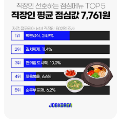실제로 잡코리아 조사에 따르면 직장인 평균 점심값은 약 7,700원이며, 식사 시간은 1시간 이내로 제한됩니다. 이러한 환경에서 맛과 가성비, 시간 효율까지 모두 잡을 수 있는 메뉴를 선택하는 것이 중요합니다.