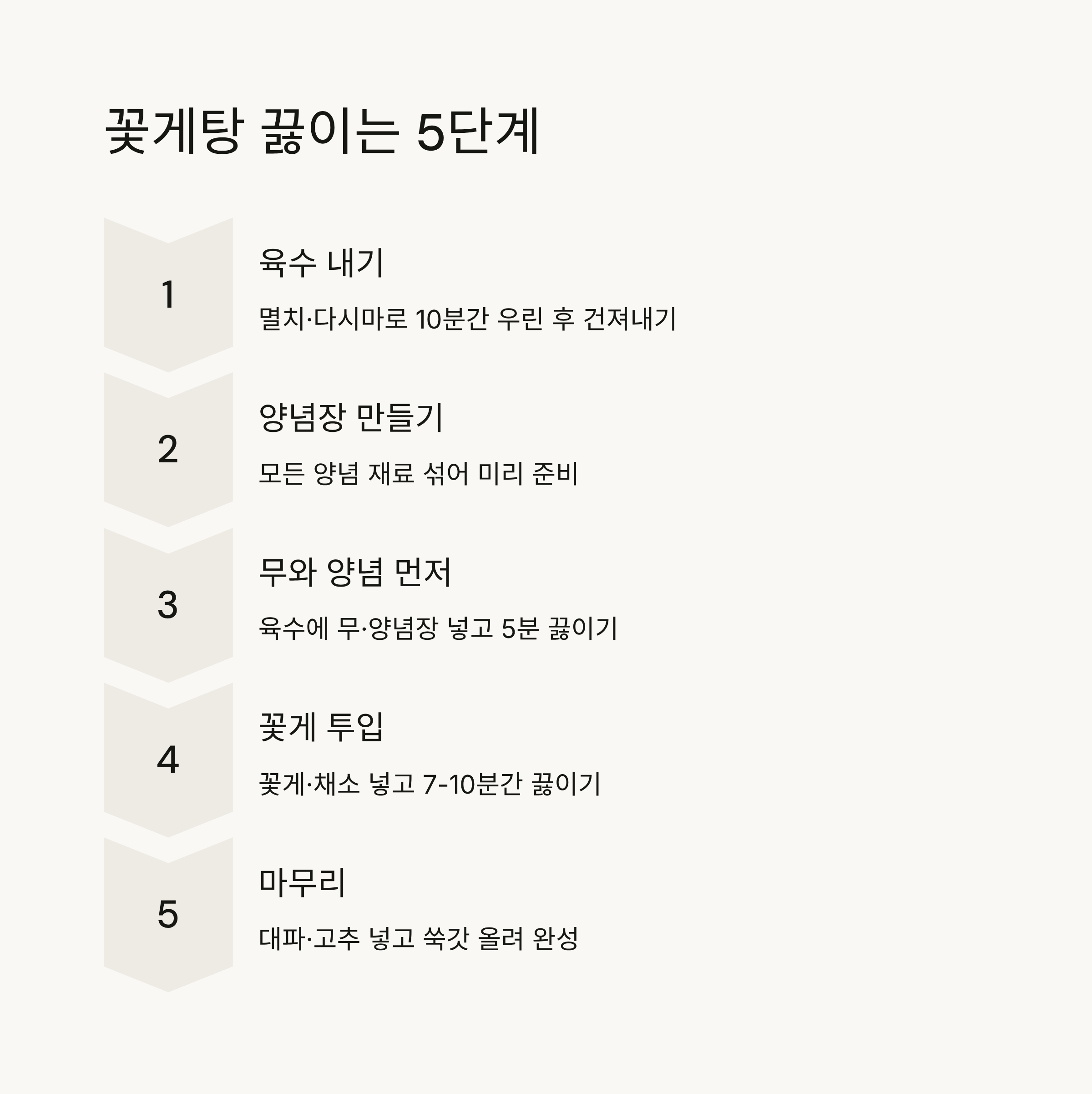 꽃게는 너무 오래 끓이면 살이 퍽퍽해지니 주의해야 합니다. 이것이 바로 성공적인 꽃게탕 끓이는 방법의 핵심 비결입니다.