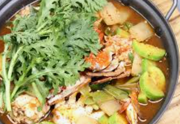 주재료 꽃게 2~3마리, 무 1/5개, 애호박 1/3개, 양파 1/2개, 대파 1대, 쑥갓 한 줌, 청양고추 2개, 홍고추 1개