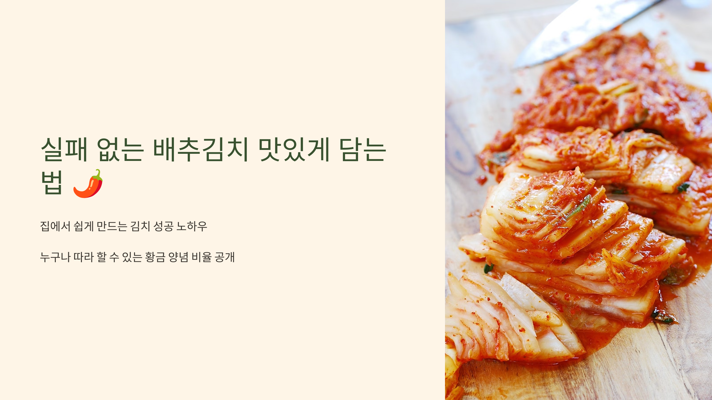 안녕하세요! 😊 한국인의 밥상에서 절대 빠질 수 없는 대표 반찬, 바로 김치입니다. 그중에서도 아삭하고 시원한 배추김치 하나면 다른 반찬이 필요 없을 정도죠. 하지만 막상 집에서 김치를 담그려고 하면 어렵게 느껴지시는 분들이 많을 텐데요.