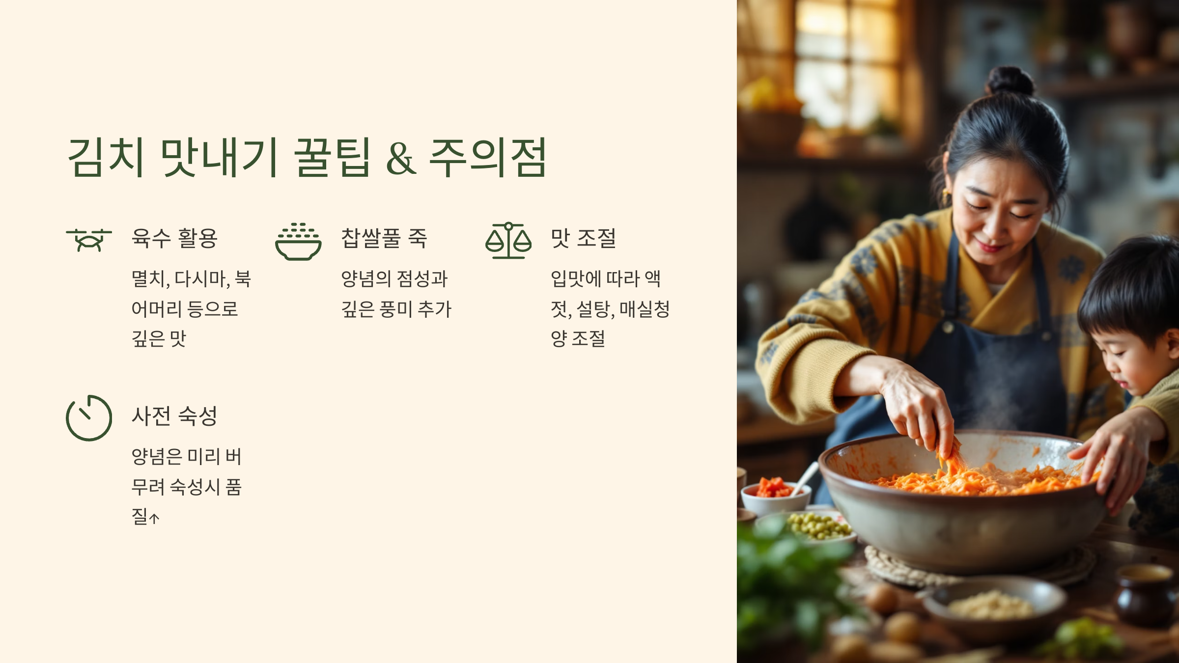 • 젓갈 선택: 한 가지 젓갈보다 멸치액젓과 까나리액젓을 섞어 사용하거나, 황석어젓 등을 추가하면 풍미가 더욱 풍부해집니다.