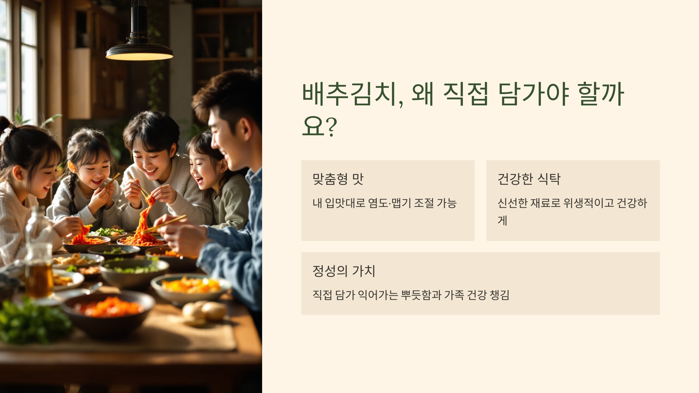 사 먹는 김치도 편리하지만, 직접 담근 김치 맛은 특별합니다. 내 입맛에 맞게 염도와 맵기를 조절할 수 있고, 신선한 재료를 직접 골라 사용하니 더욱 안심할 수 있죠.