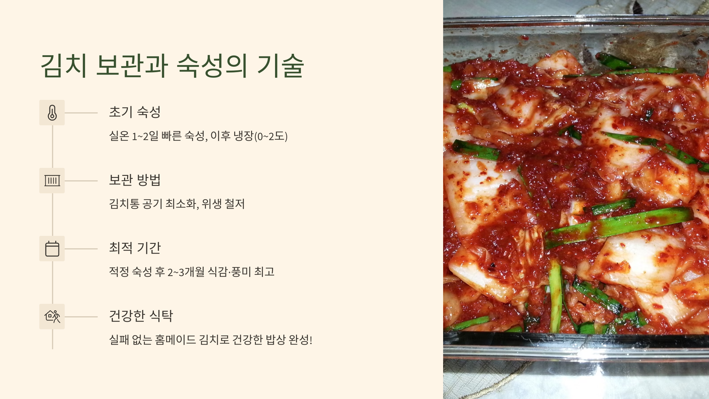 보관 온도를 낮추고, 김치 위에 비닐을 덮어 공기 접촉을 차단하면 좋습니다. 절임 과정과 물기 제거가 배추김치 맛있게 담는법에서 군내 없이 아삭함을 유지하는 비결입니다.