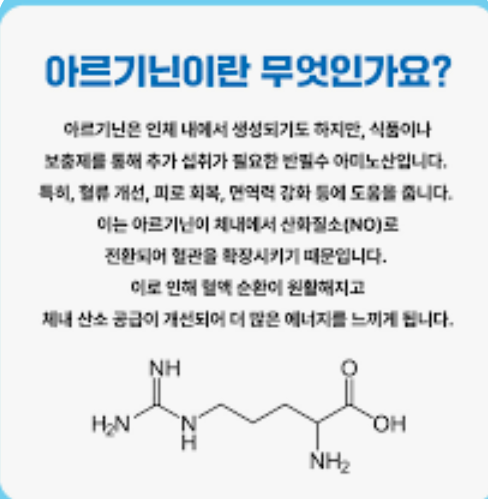 * 섭취 시간: 아르기닌은 다른 아미노산과 흡수 경쟁을 할 수 있어 공복에 섭취하는 것이 가장 좋습니다. 보통 아침 공복이나 잠들기 전, 또는 운동 30분 전에 드시는 것을 추천합니다.