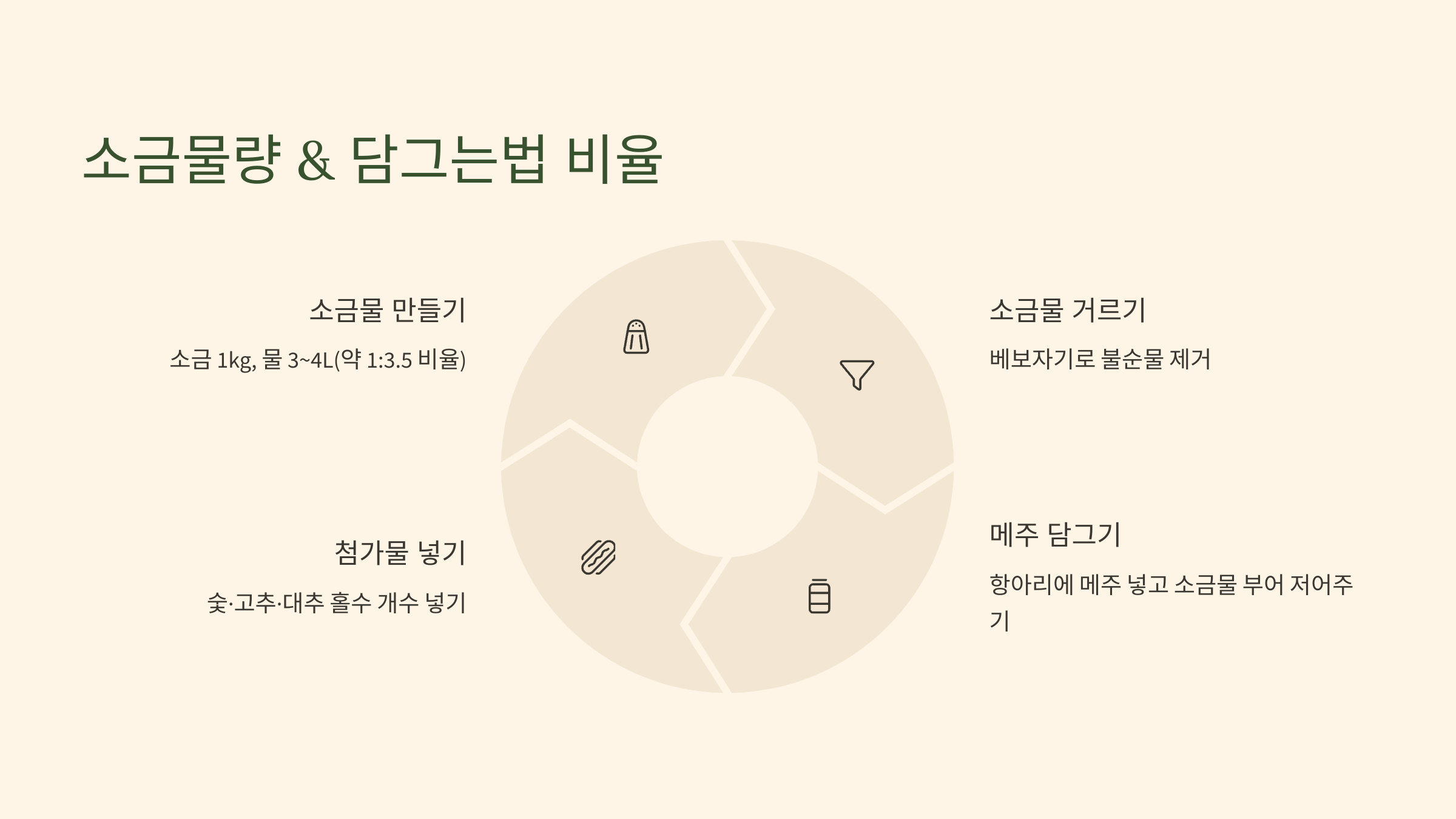 | 전통적인 방식 | 물 10컵(2L) | 소금 1.8~2.2kg (18~22%) |