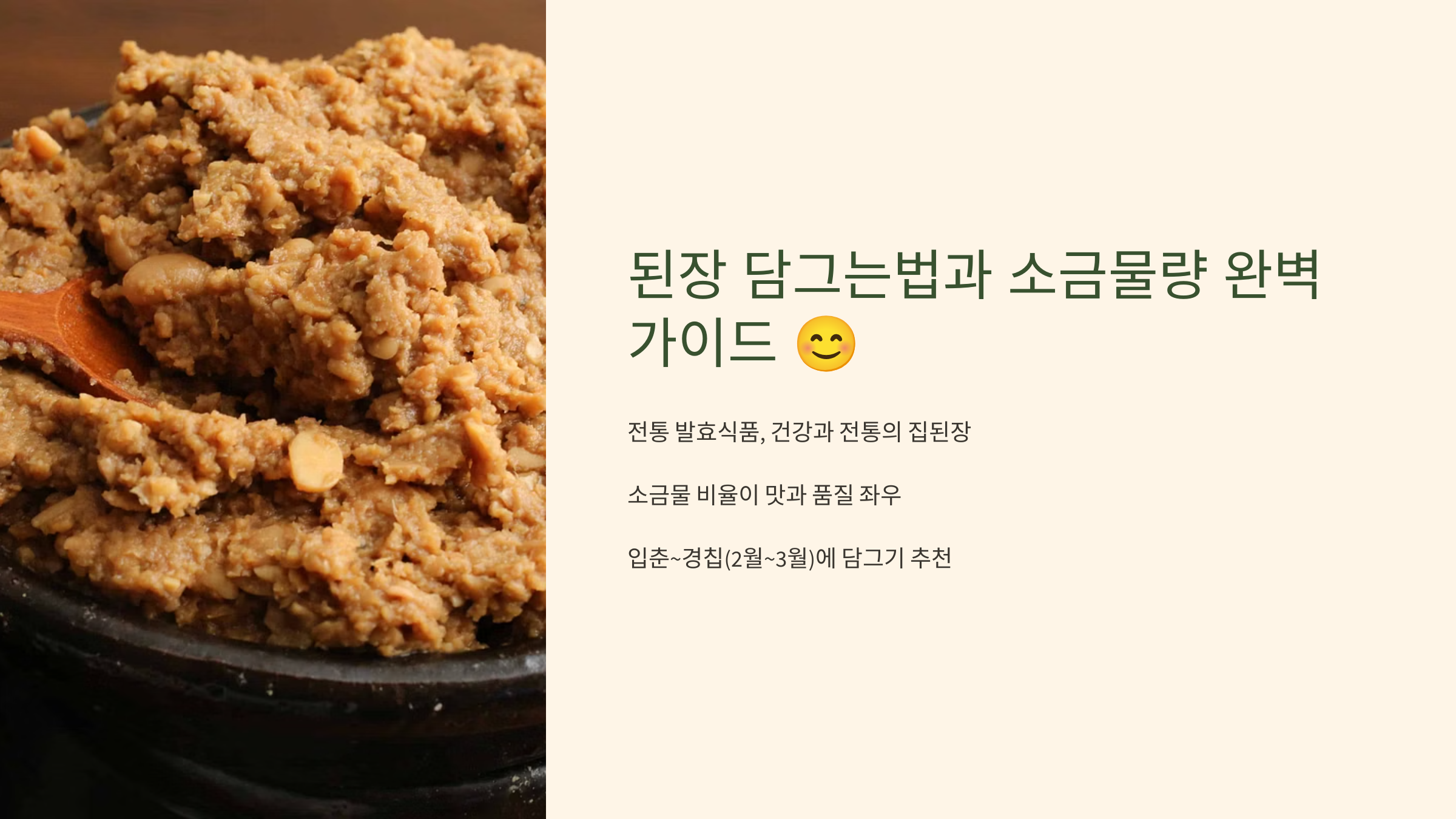 우리 전통 발효식품인 된장은 단순한 조미료를 넘어 건강에도 좋은 귀한 식품입니다. 집에서 직접 된장을 담그는 사람들이 늘고 있는데요, 된장 담그는법에서 가장 중요한 것은 바로 소금물량의 적정 비율입니다. 오늘은 메주에서 시작해 맛있는 된장을 완성하는 전 과정을 상세히 알아보겠습니다.