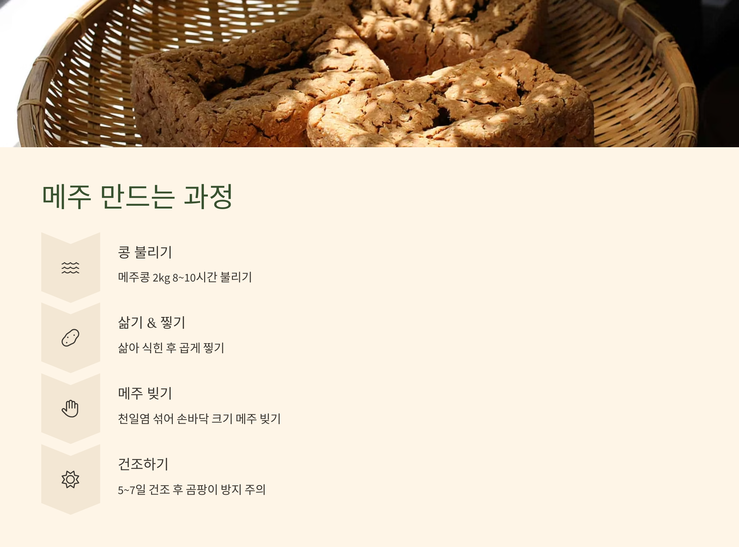 | 메주 기준 | 메주 1kg | 소금물 2L (18~20% 염도) |