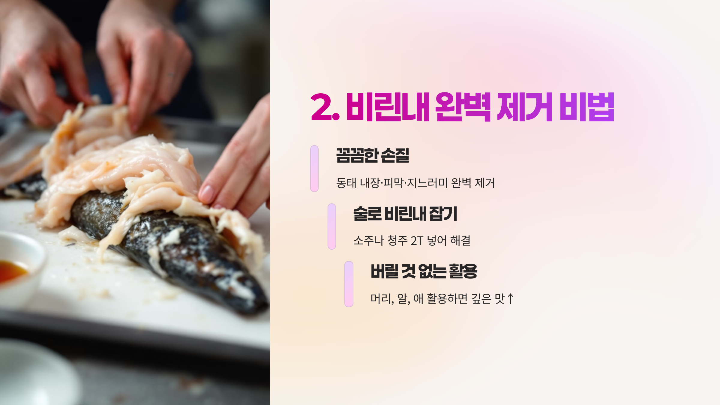 - 비린내 완벽 제거: 동태 손질 시 쌀뜨물에 10분 정도 담가두거나, 마지막 헹굼물에 식초 몇 방울을 떨어뜨리면 비린내 제거에 효과적입니다.