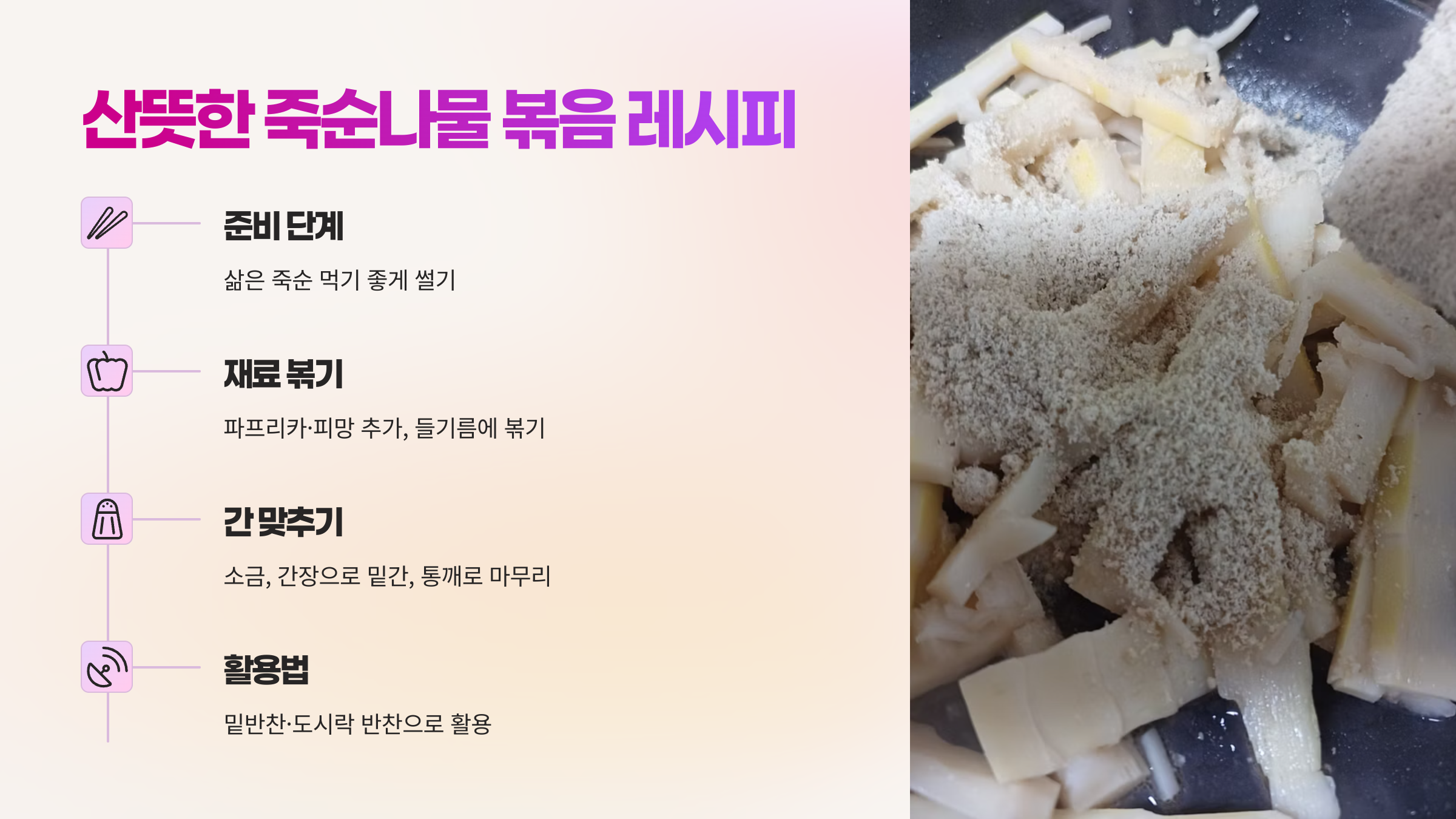 - 죽순이 부드러워지면 국간장과 소금으로 간을 하고, 들깻가루와 다진 파를 넣어 가볍게 섞어 마무리합니다.