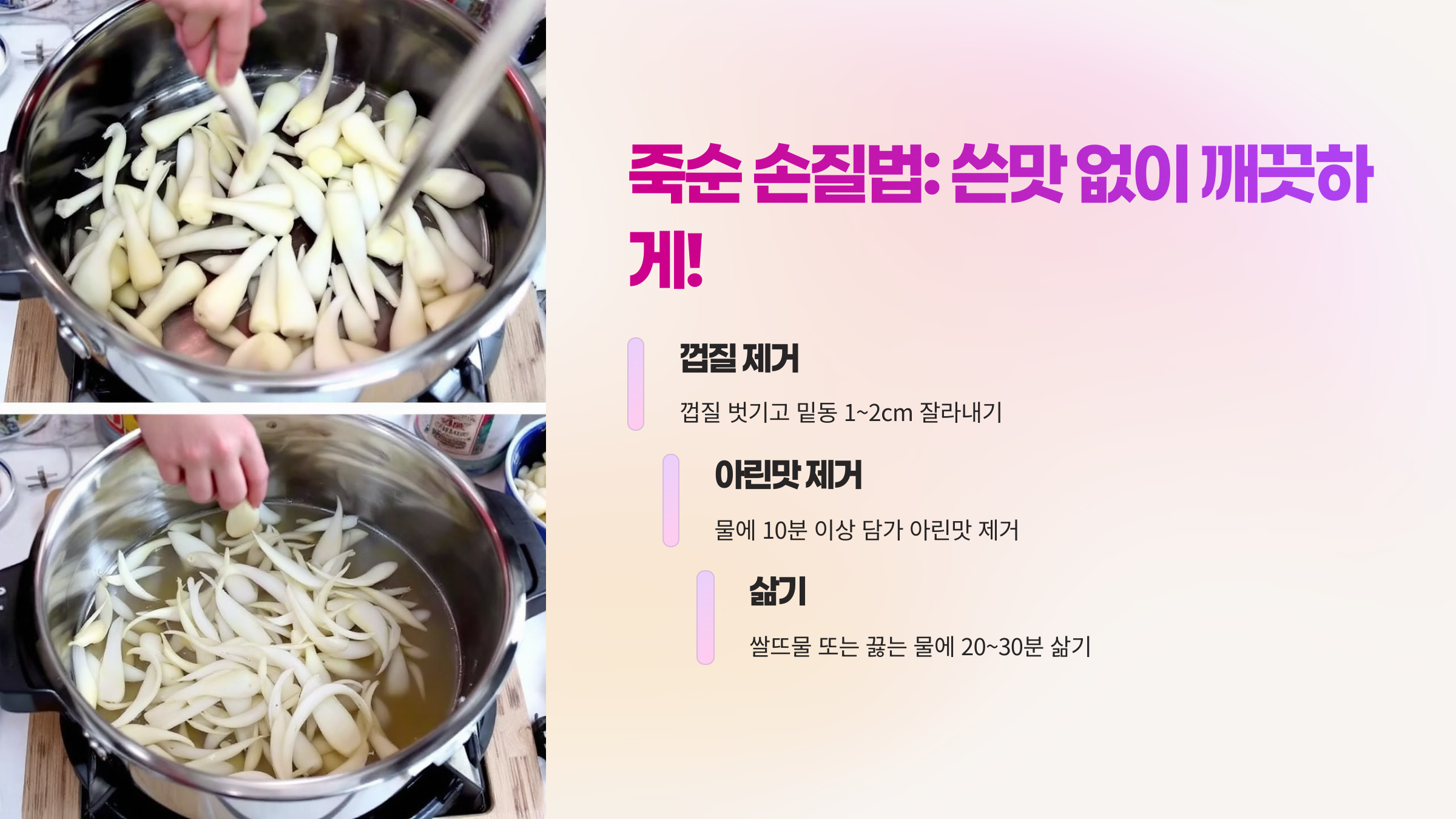 이 손질 과정만 잘 거치면 어떤 **죽순 요리법**을 활용하든 맛있는 요리를 완성할 수 있습니다.