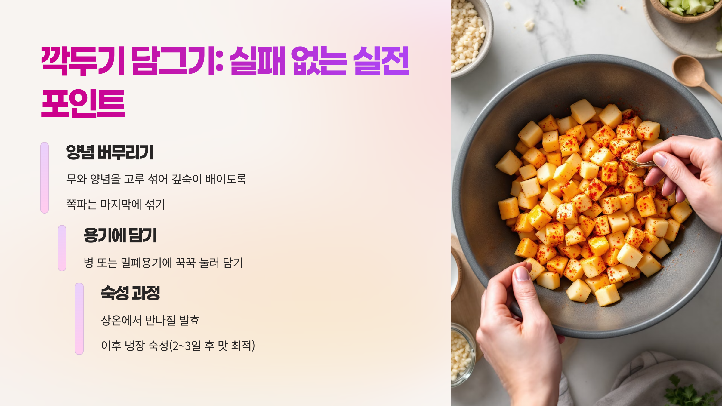 오늘은 초보자도 실패 없이 아삭하고 시원한 깍두기 맛있게 담는법을 알려드릴게요. 저만의 특별한 깍두기 황금레시피와 꿀팁까지 모두 공개하니, 끝까지 주목해주세요! 📌