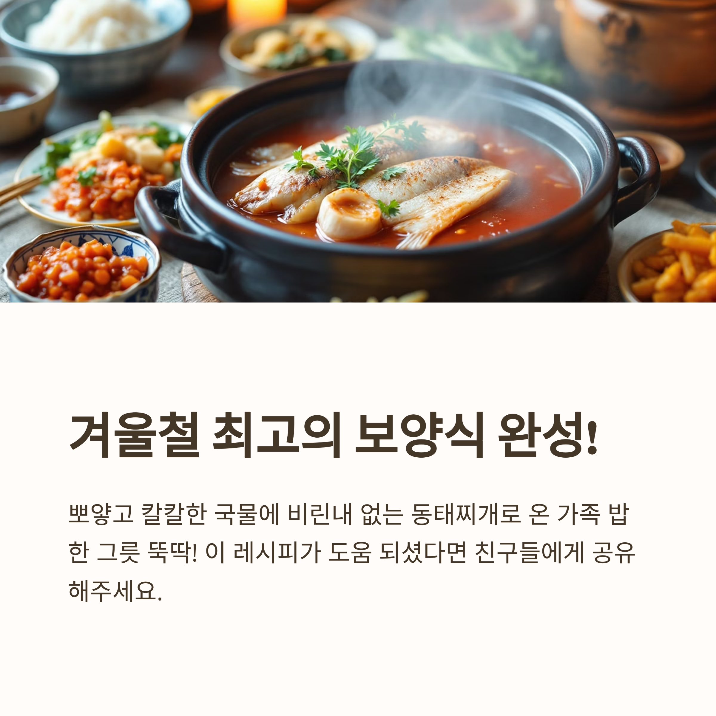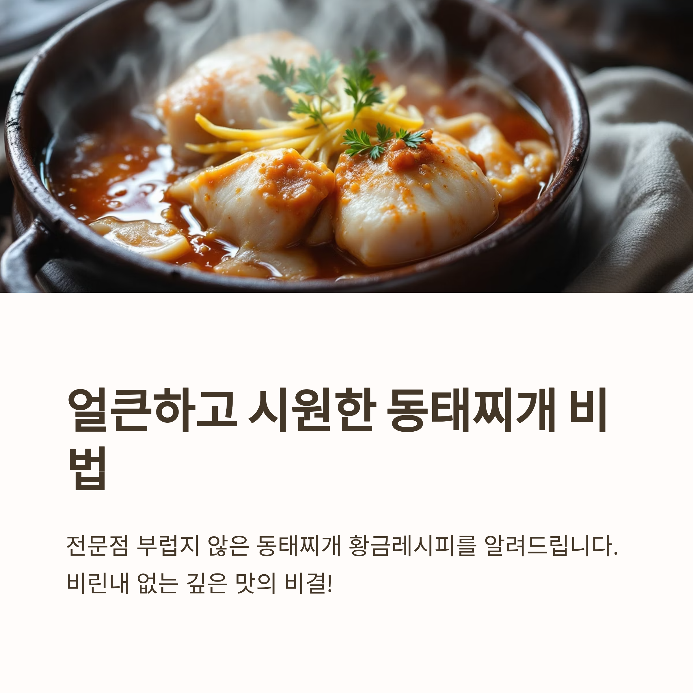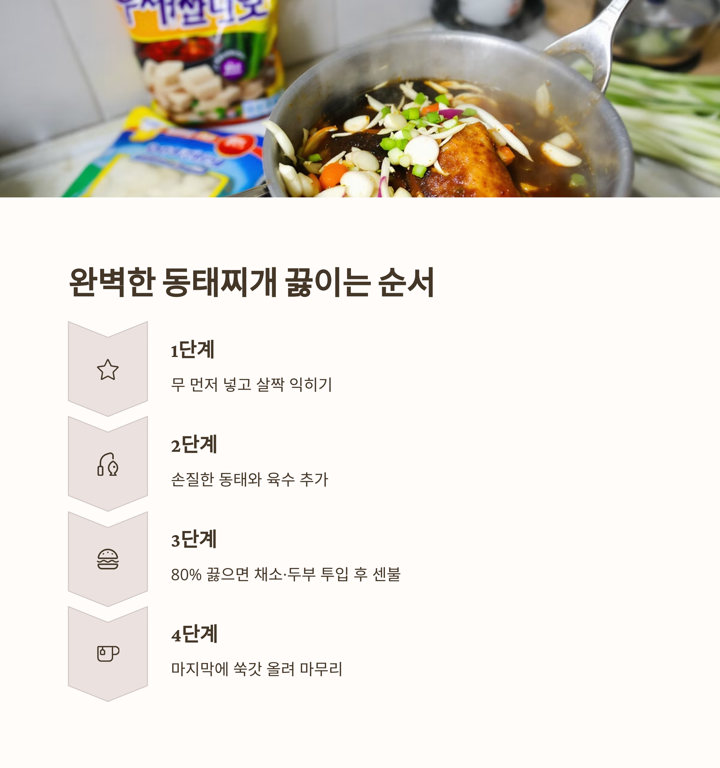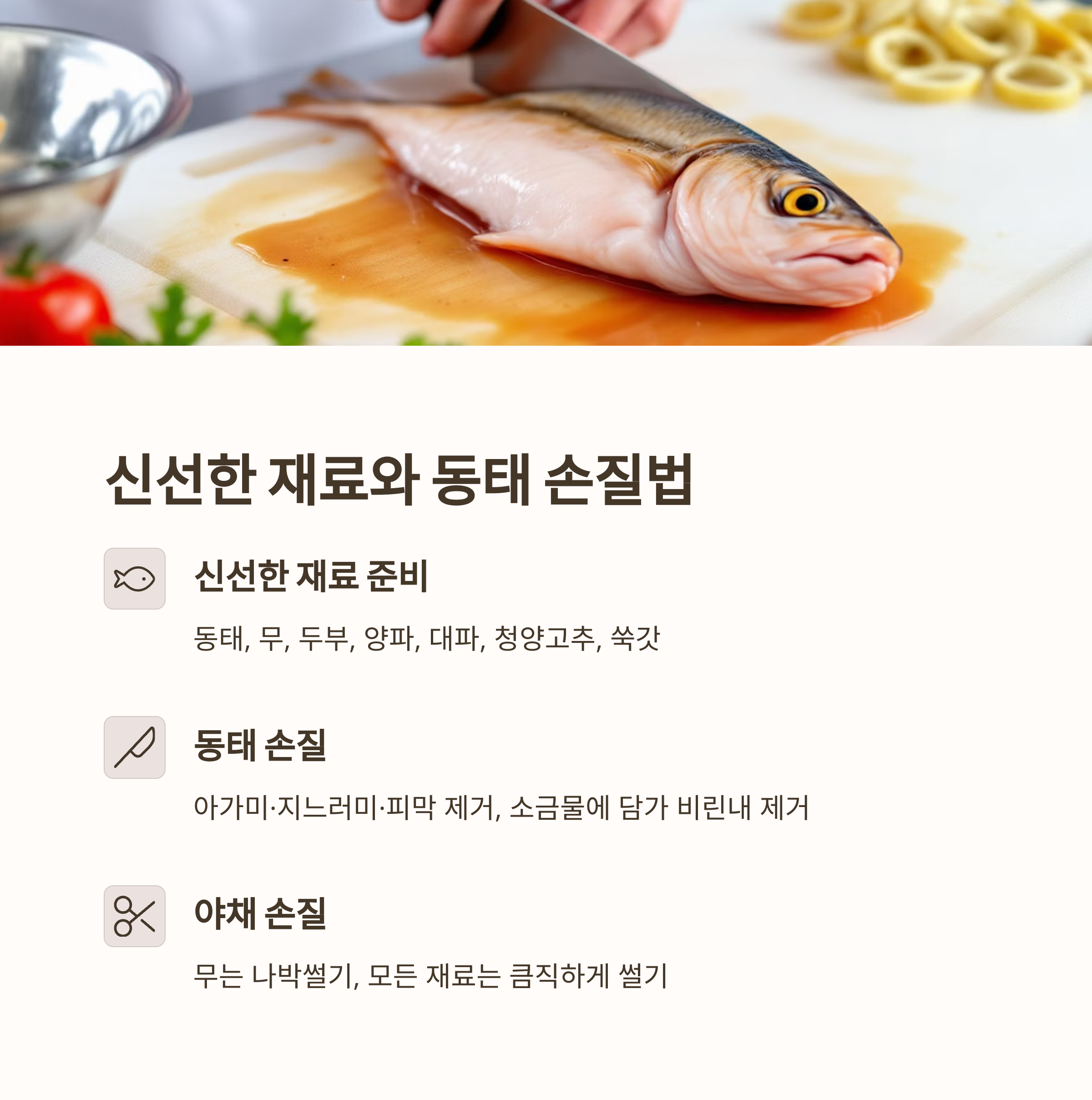 셋째, 동태 손질부터 양념장 비율, 끓이는 순서까지, 실패 확률을 제로로 만드는 디테일한 팁을 담았습니다. 이대로만 따라 하시면 누가 끓여도 맛있는 동태찌개를 완성할 수 있을 거예요!