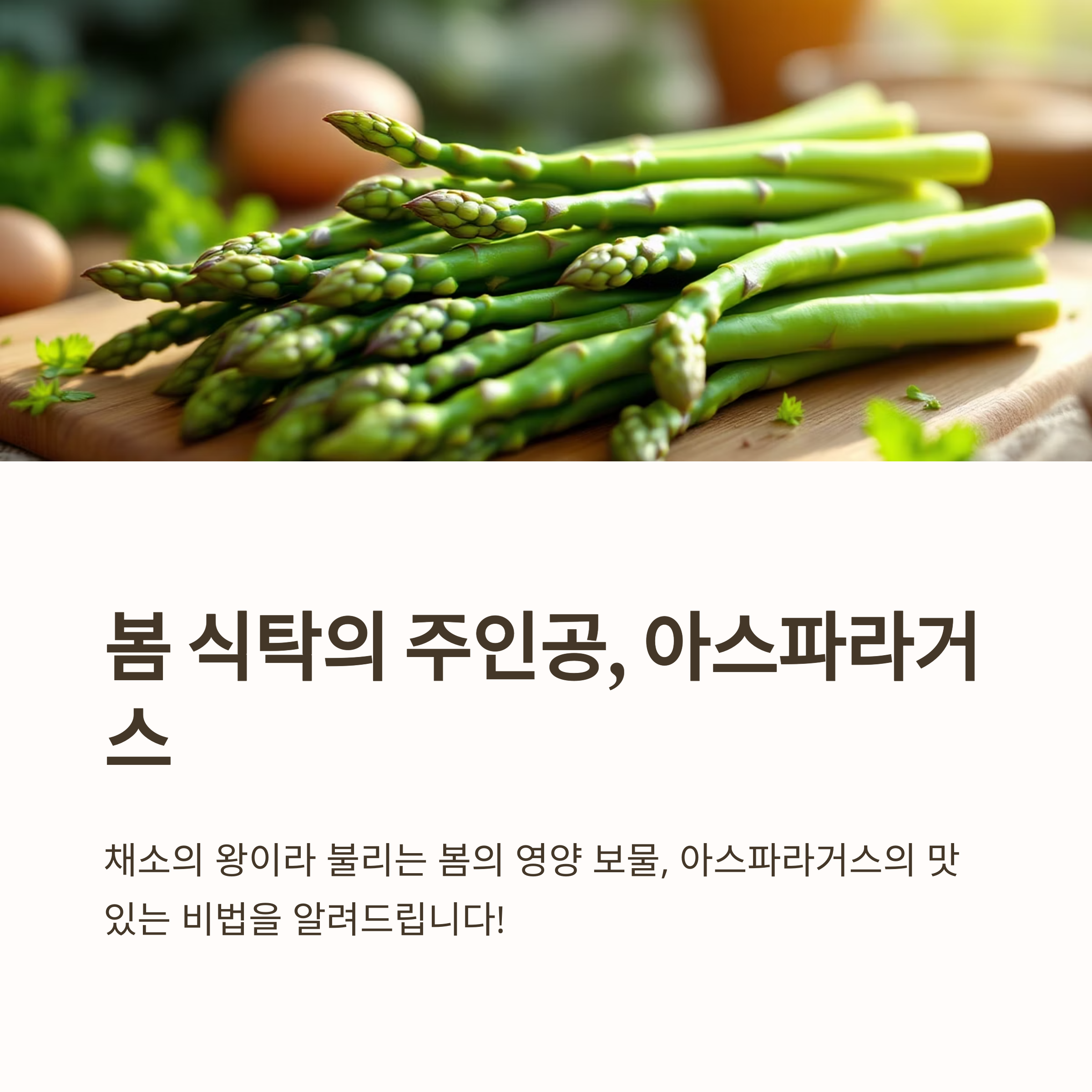이번 주말, 싱그러운 아스파라거스로 건강하고 맛있는 식탁을 차려보는 건 어떨까요? 여러분만의 특별한 아스파라거스 요리법도 공유해주세요!