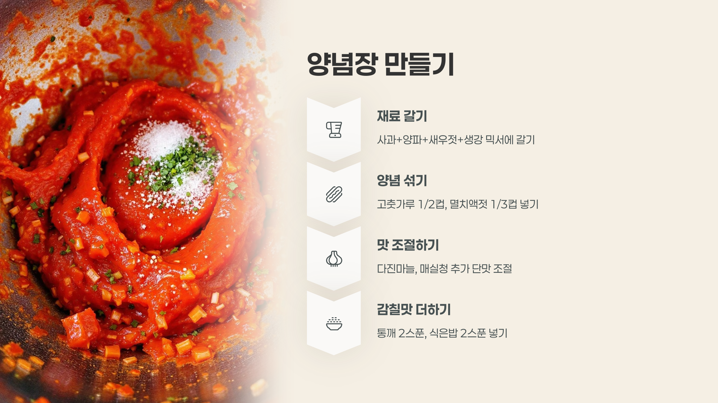 볼에 식힌 찹쌀풀, 고춧가루, 액젓, 다진 마늘, 다진 생강, 매실청(또는 설탕), 썰어둔 부추와 양파를 넣고 골고루 섞어 양념소를 만듭니다. 간을 보고 싱거우면 액젓을, 단맛이 부족하면 매실청을 약간 추가하세요.