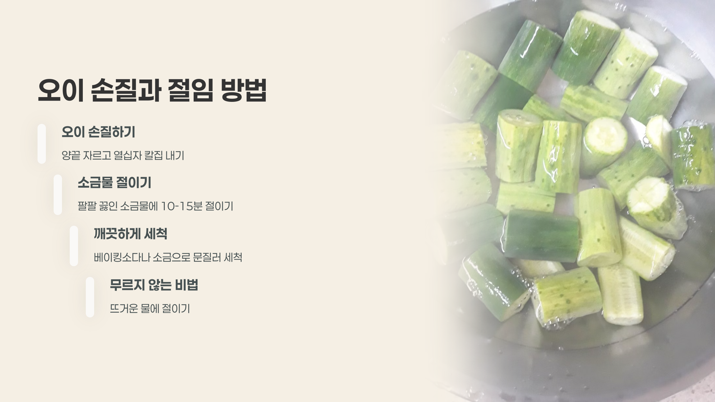 1. 오이 손질 및 절이기 (아삭함의 핵심!)