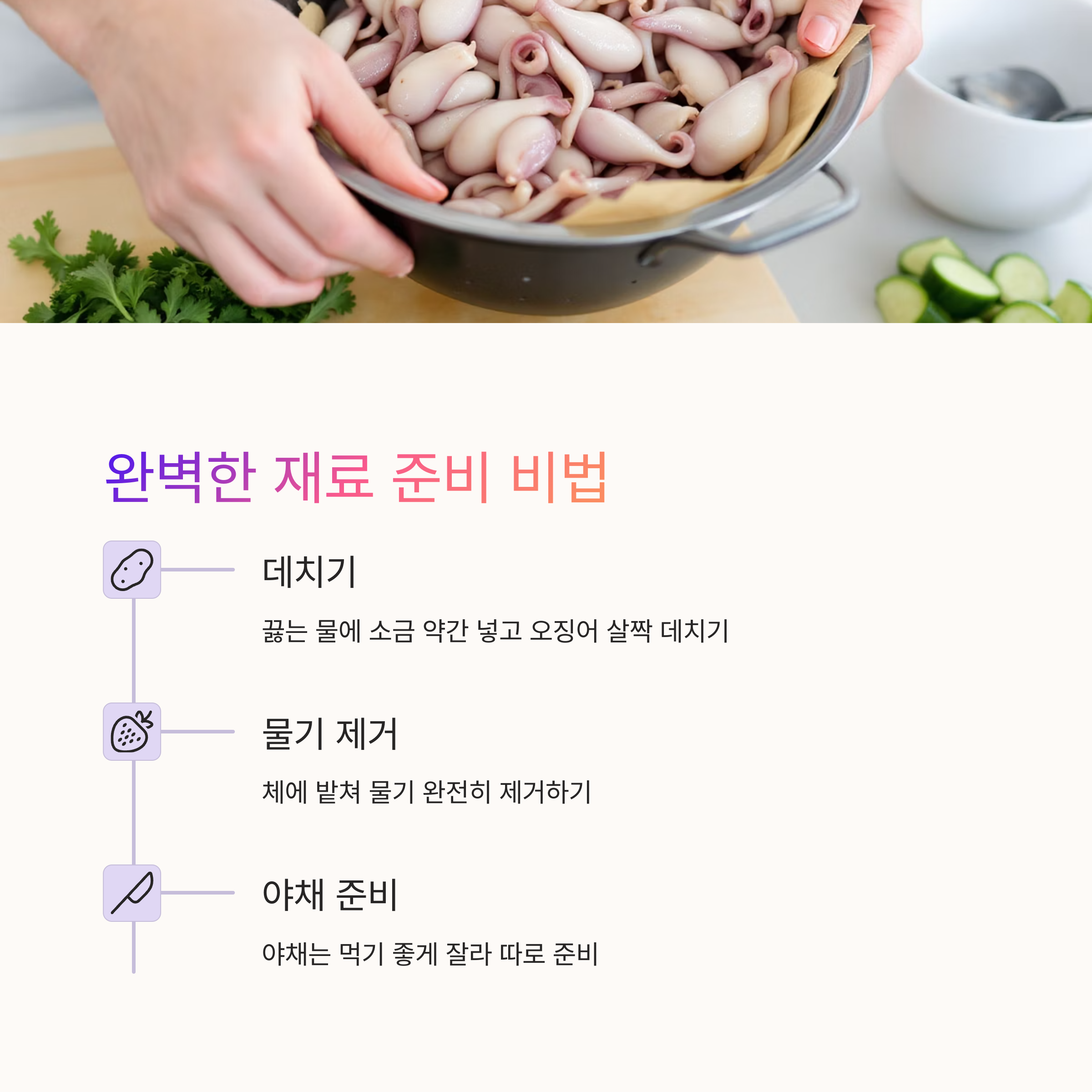 오징어를 살짝 데치거나 따로 볶아 수분을 한번 날려주는 것도 좋은 방법이에요. 오늘은 재료를 따로 볶는 번거로움 없이, 팬 하나로 끝내는 가장 간단하면서도 확실한 방법을 알려드릴게요.