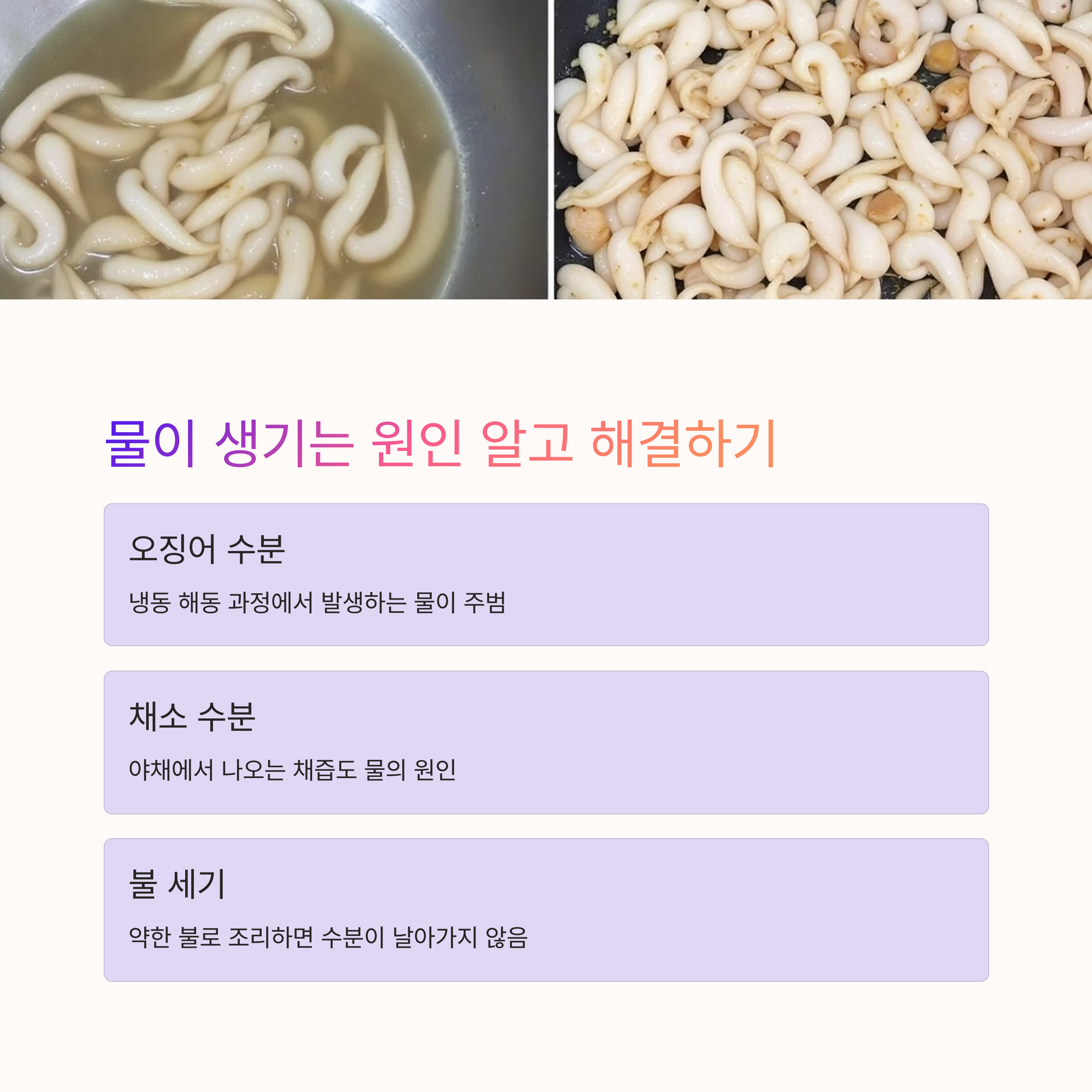 오징어볶음의 성패는 '수분 조절'에 달려있다고 해도 과언이 아니에요. 오징어 자체에서도 물이 나오고, 함께 볶는 채소들에서도 수분이 빠져나와 양념이 묽어지는 것이죠. 이 문제를 해결하는 핵심 비법은 바로 '강한 불에서 빠르게' 볶아내는 것과 재료를 볶는 순서에 있습니다.