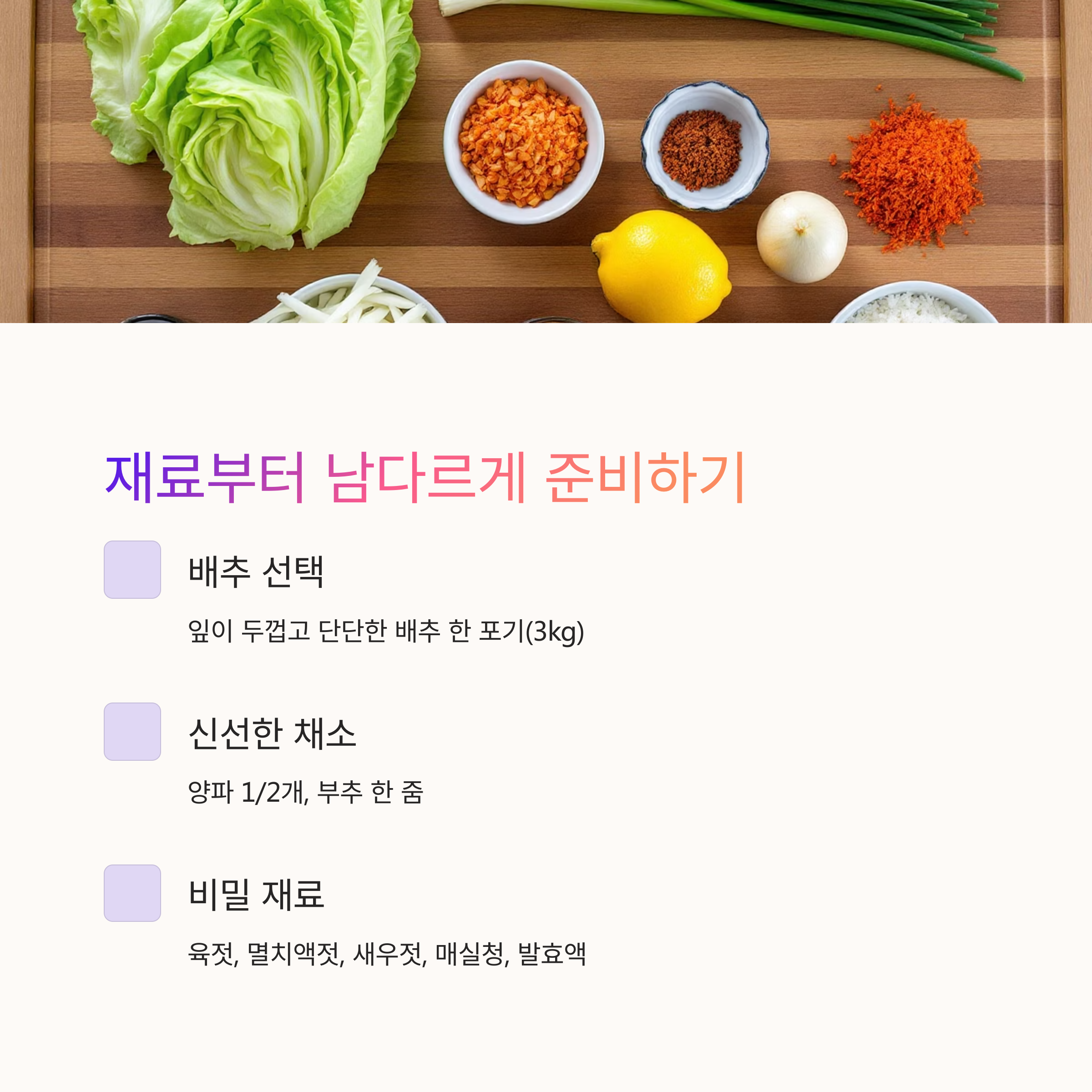 좋은 재료가 맛있는 요리의 시작입니다. 겉절이의 주인공인 배추부터 양념까지, 꼼꼼하게 알아볼게요.