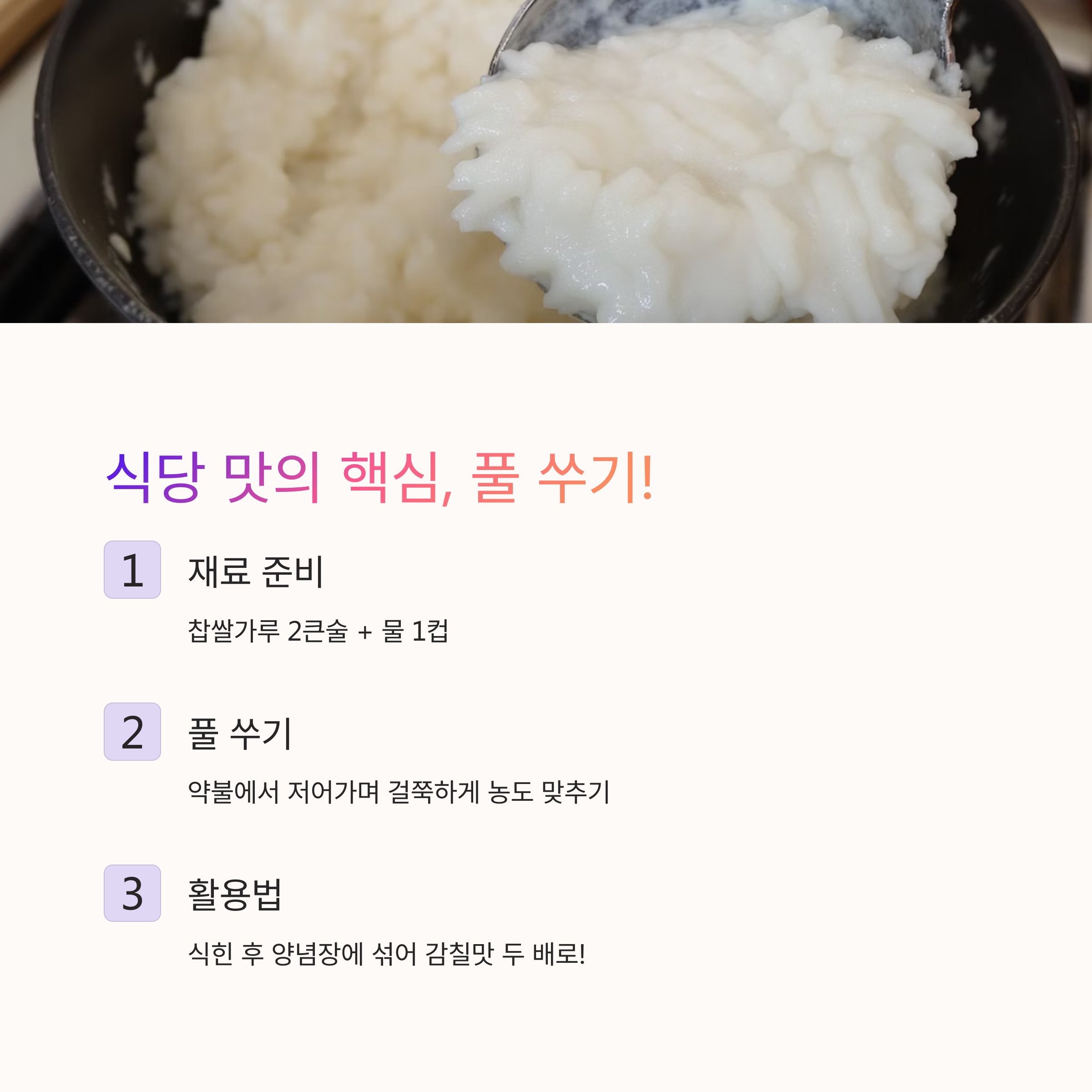 풀은 양념이 배추에 착 달라붙게 하고, 은은한 단맛을 더해 맛을 한층 부드럽게 만들어준답니다. 풀 쑤는 법, 아래에서 아주 쉽게 알려드릴게요!