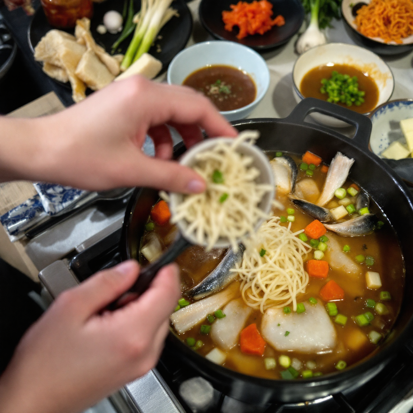 A: 아주 좋은 생각입니다! 수제비 반죽은 생선과 양념장을 넣고 끓일 때 함께 넣고, 라면 사리는 모든 재료가 다 익은 마지막에 넣어 끓여 드시면 됩니다. 단, 사리를 넣으면 국물이 짜지고 탁해질 수 있으니 미리 뜨거운 물을 조금 준비해두었다가 간을 조절하는 것이 좋습니다.