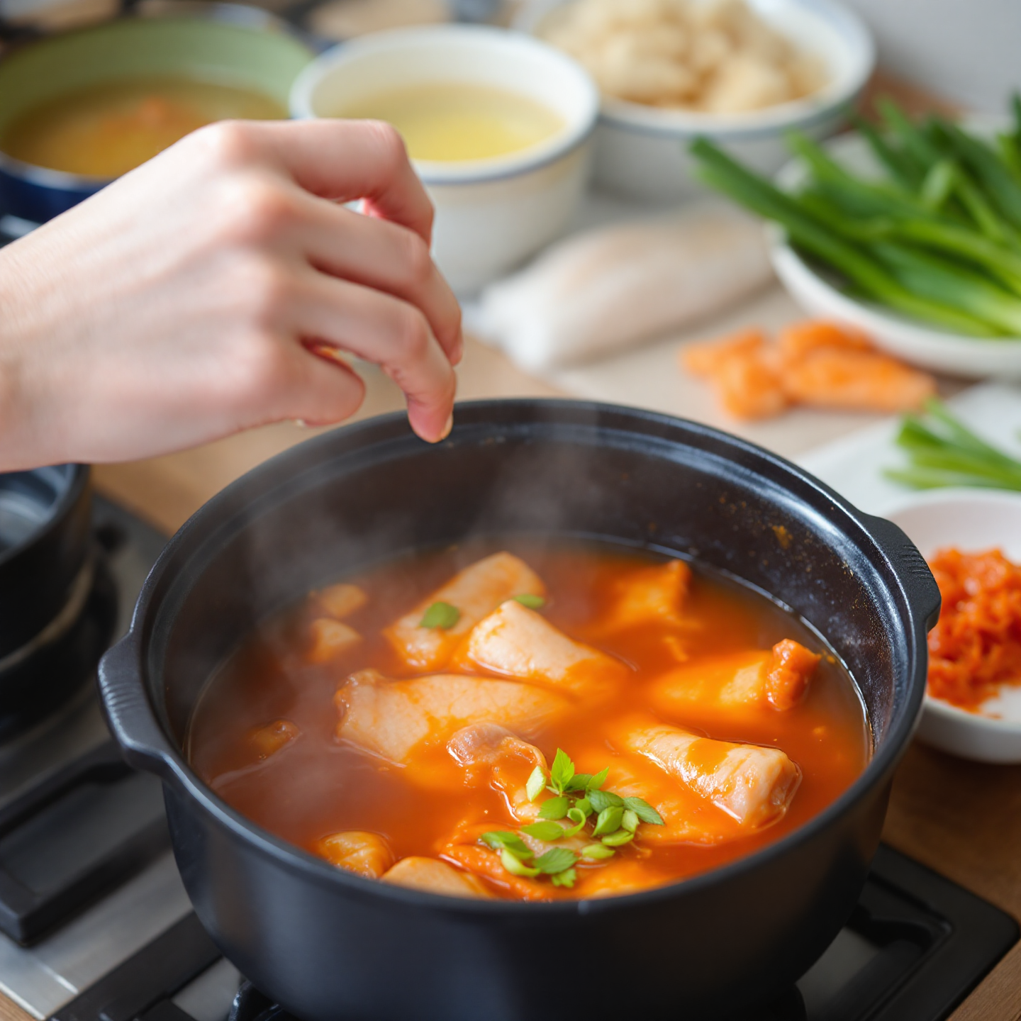 맹물보다는 진하게 우린 육수가 국물 맛의 깊이를 좌우합니다. 나박 썬 무와 국물용 멸치, 다시마를 넣고 끓여 만드는 기본 육수는 필수입니다. 여기에 파뿌리나 양파 껍질을 함께 넣고 끓이면 한층 더 시원하고 깊은 맛을 낼 수 있습니다.