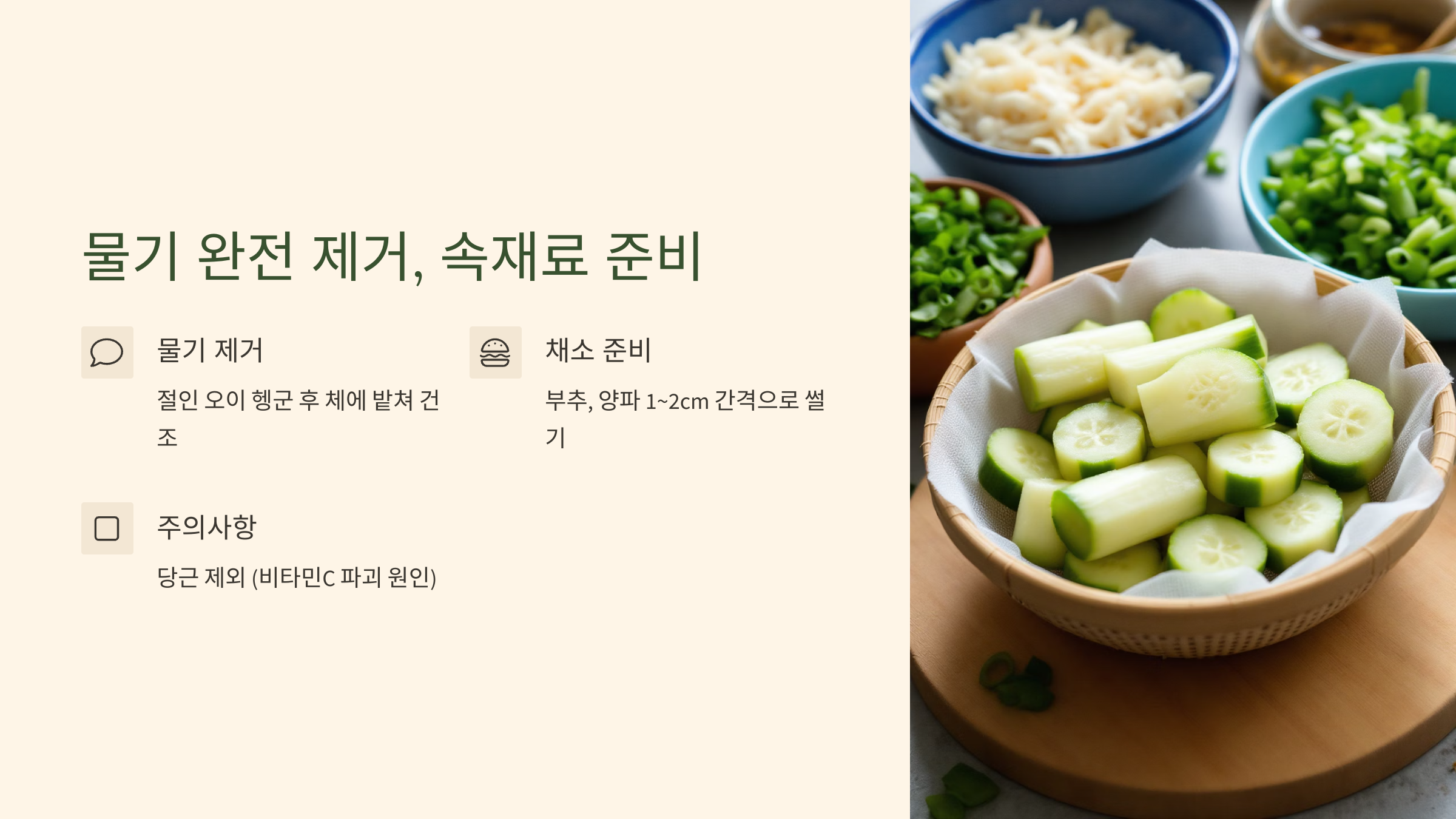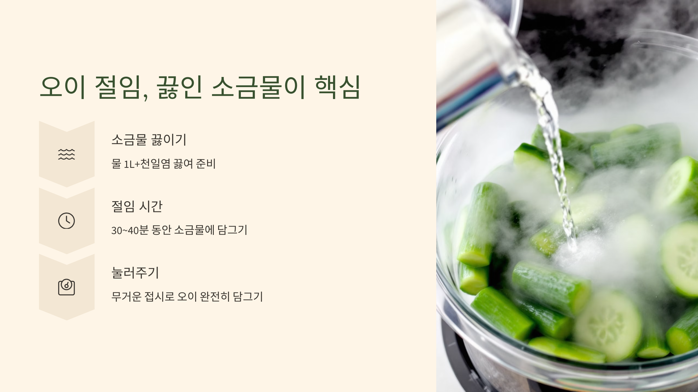 • 끓는 소금물 활용: 물 10컵 기준 굵은 소금 1컵 비율로 소금물을 팔팔 끓여 준비된 오이에 뜨거울 때 바로 부어줍니다. 오이가 잠길 정도로 붓고, 20~30분 정도 절인 후 찬물에 헹궈 물기를 완전히 제거합니다. 이 방법은 오이 색깔이 더 선명해지고 아삭함이 오래가는 장점이 있습니다.