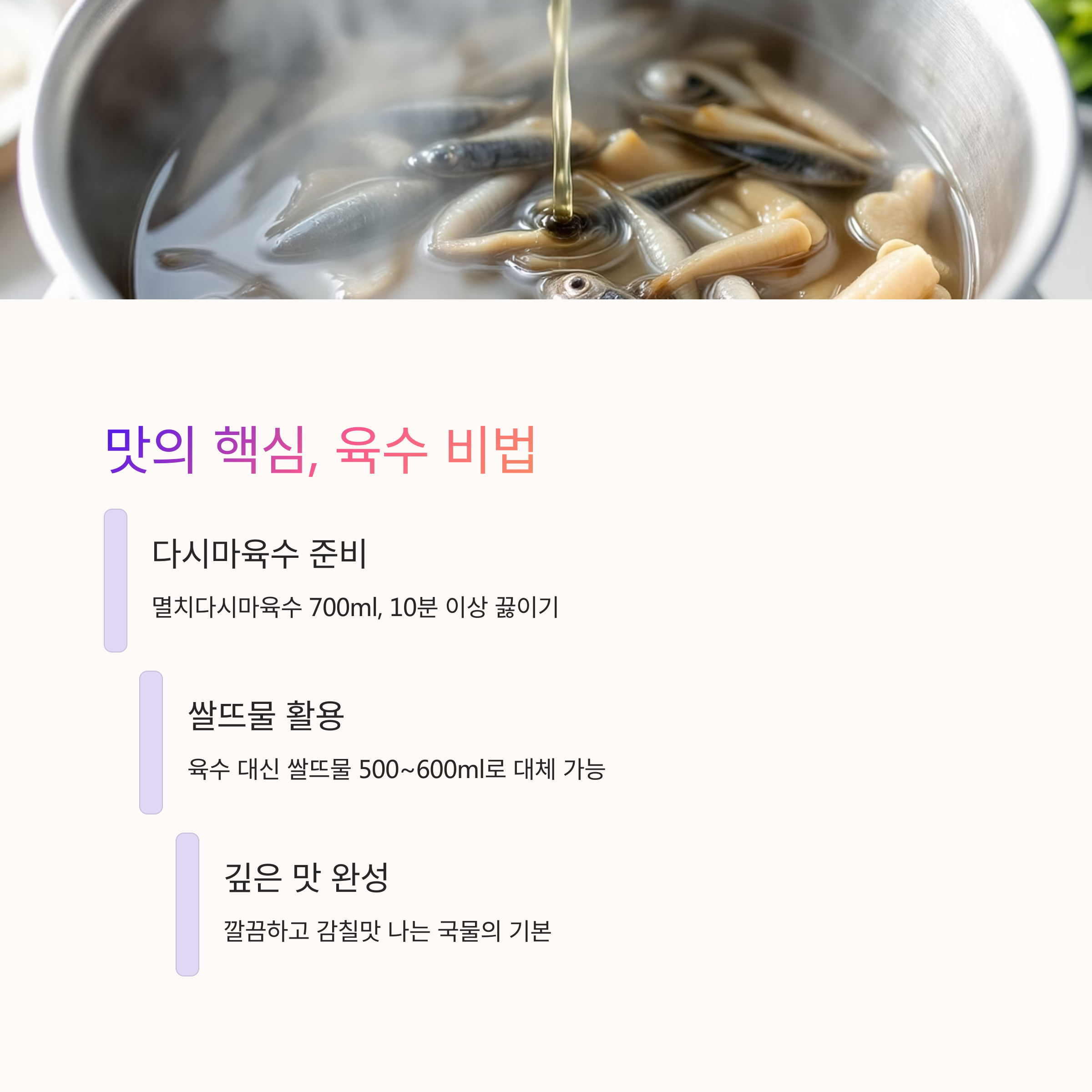 저는 육수에 무 한 조각(5cm)을 추가했더니 국물이 더 시원하고 깔끔하더라고요. 육수는 미리 만들어 두면 조리 시간이 훨씬 단축됩니다!