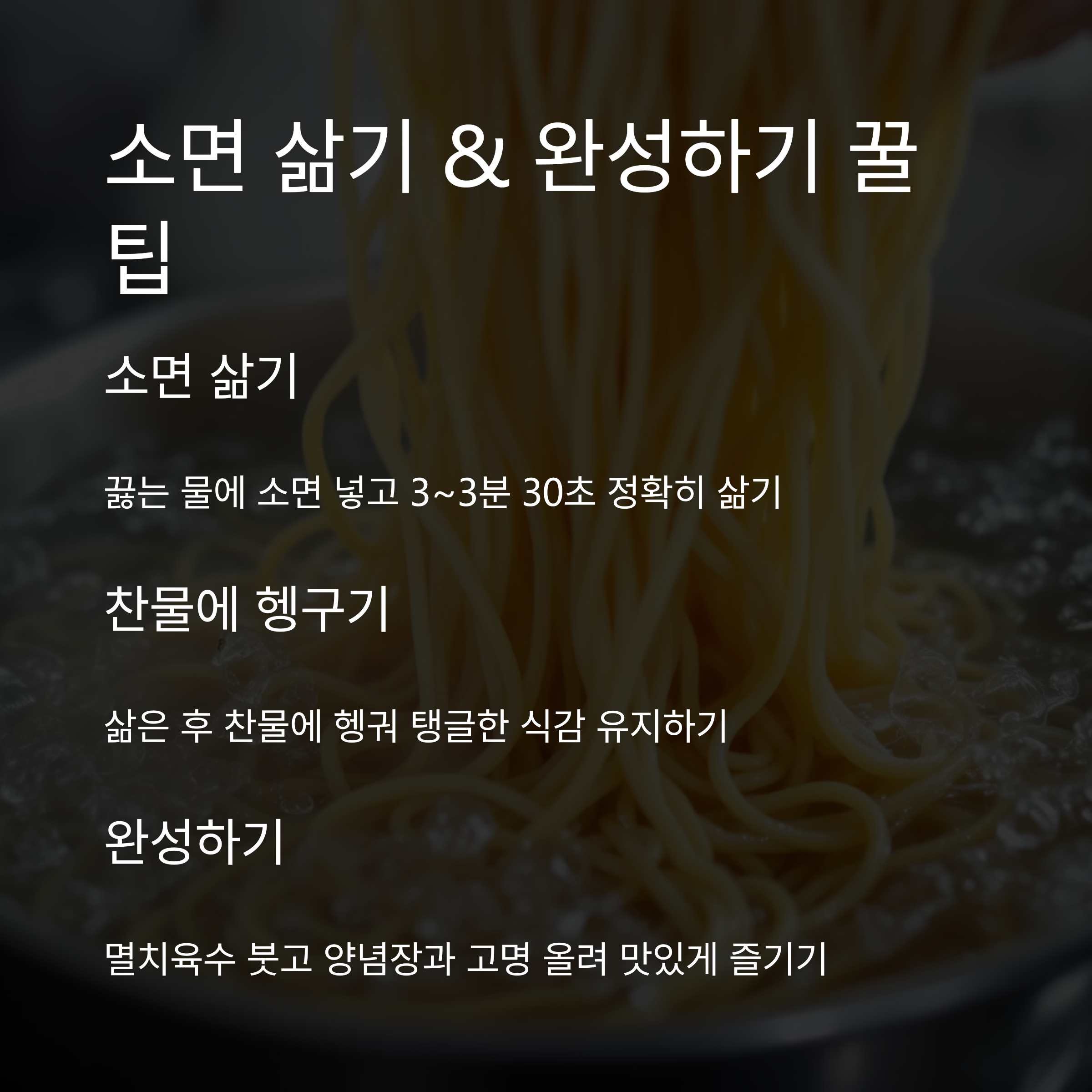 소면은 3~4분 삶아 투명해지면 바로 찬물에 헹궈야 쫄깃한 식감을 유지할 수 있어요. 너무 오래 삶으면 퍼질 수 있으니 주의하세요.