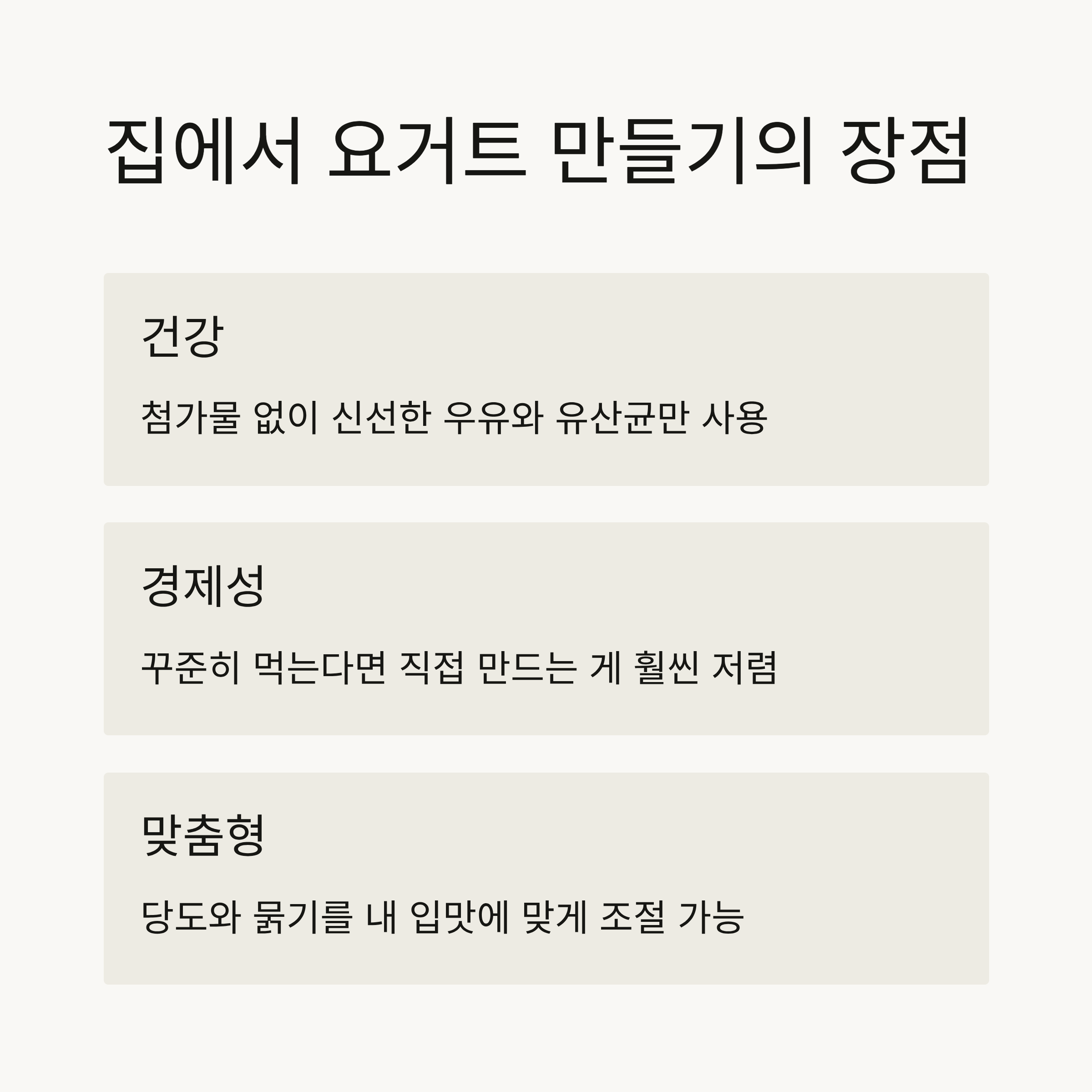하지만 집에서 만들면 오직 신선한 우유와 유산균만으로 만들기 때문에 안심하고 먹을 수 있어요. 아이들 간식으로도 최고랍니다. 또한, 꾸준히 요거트를 드신다면 직접 만들어 먹는 것이 훨씬 경제적이에요. 내 입맛에 맞게 당도나 묽기를 조절할 수 있다는 것도 큰 장점이죠.
