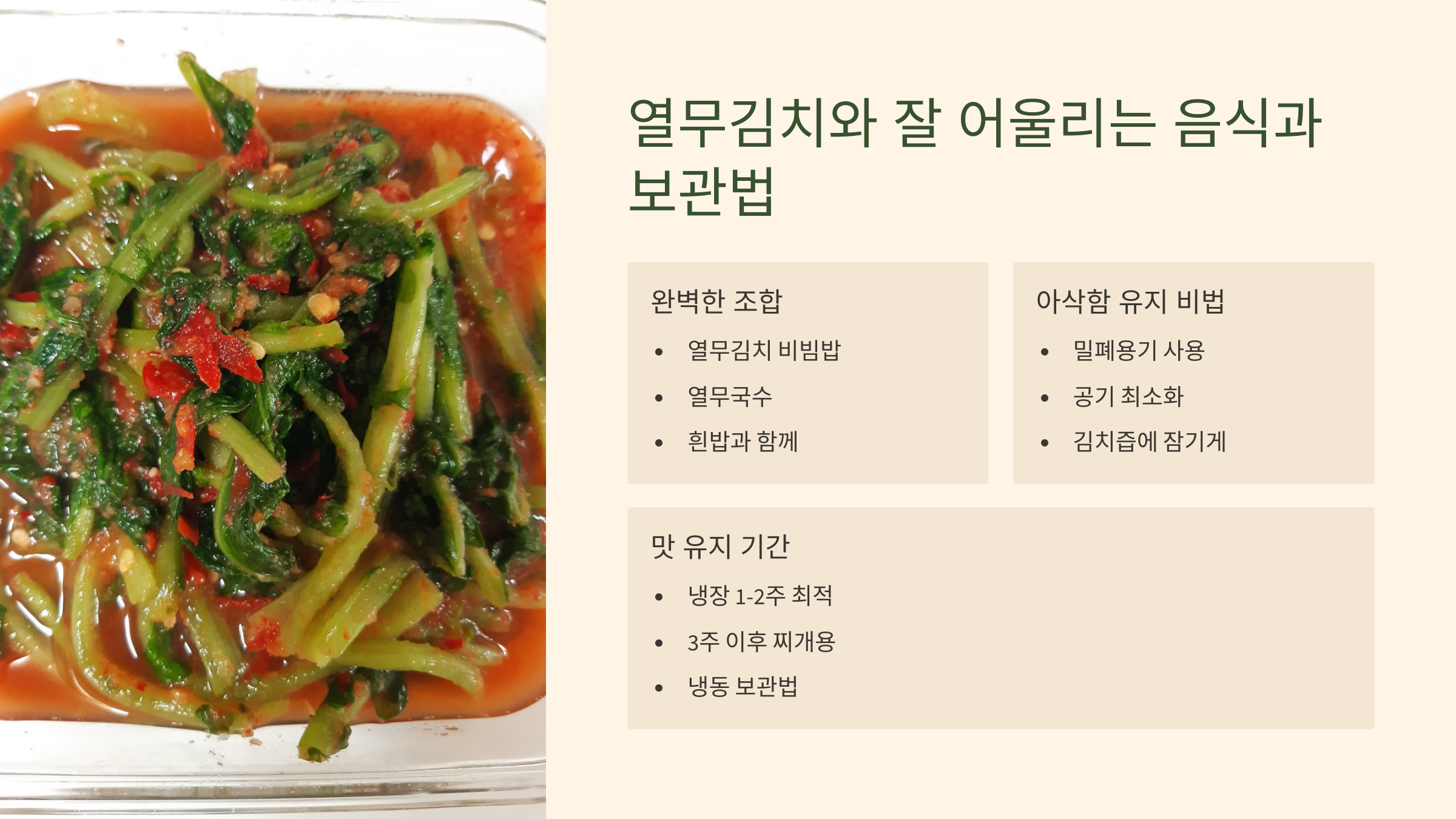❓ Q2: 열무김치가 금방 물러져요. 아삭하게 오래 보관하는 방법은?